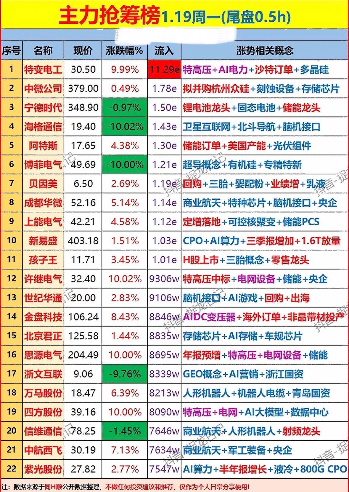 主力抢筹榜1.19周一(尾盘0.5h),揭秘涨势概念股! 主力抢筹榜:特高压、AI电力、储能、脑机接口等概念股受追捧,多只个股涨停,资金流入明显