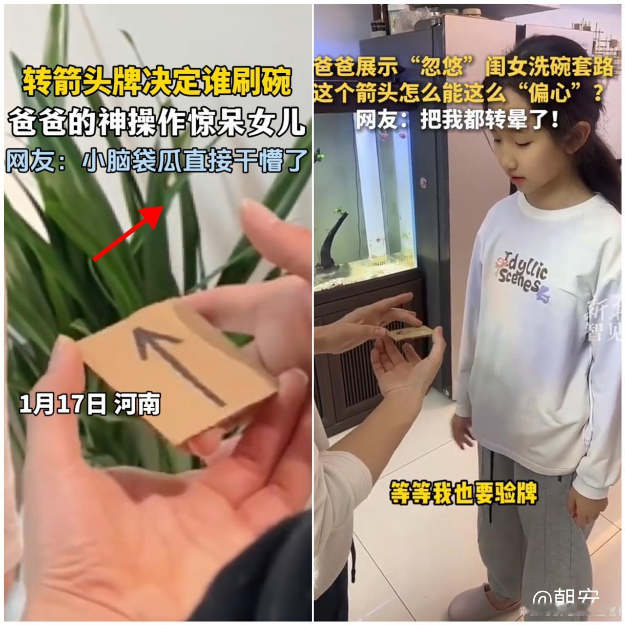 彻底蒙圈了! 老爸靠一块纸块忽悠女儿刷碗,这操作太绝了! 河南一老爸的“刷碗套路”笑喷全网! 吃完饭不想洗碗,竟拿块画了箭头的纸块,跟女儿玩“箭头指谁谁洗碗”的游戏。 女儿警惕性挺高,先要求验牌,看着箭头指向老爸才放心答应,结果老爸悄悄换了捏纸块的对角,不管怎么转箭头都对着女儿,直接把娃干懵了! 这哪里是玩游戏,分明是老父亲的“套路天花板”! 女儿那点小心思早被拿捏得死死的,验牌环节看似公平,实则老爸早就留好了后手。 不得不说,姜还是老的辣,这种带点小机灵的亲子互动,比直接使唤孩子有趣多了,既哄了娃又省了活儿。 网友调侃这是“被忽悠次数多了,才有了验牌意识”,果然是父女之间的极限拉扯。 你家有没有这种靠小聪明“偷懒”的趣事?