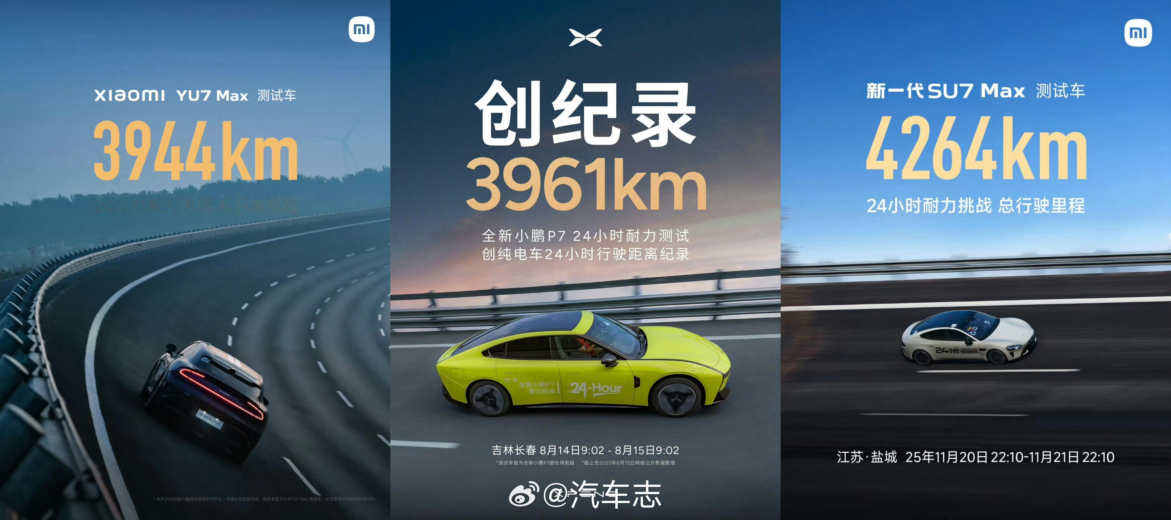 小米新SU7刷新24小时耐力挑战纪录最终成绩4264km,刷新了小鹏新P7保持的3961公里纪录~