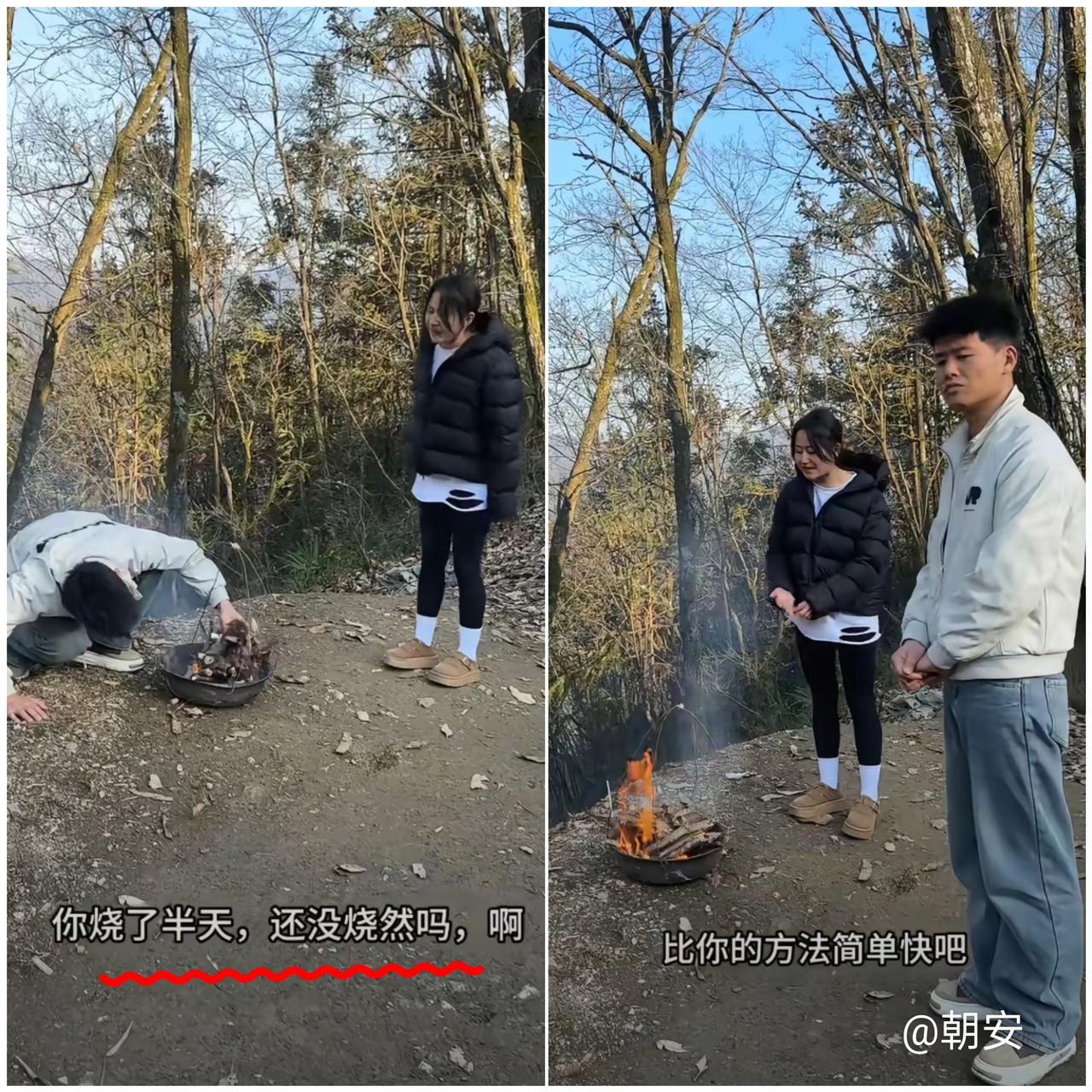 长见识了! 陕西一男子蹲地上点枯枝取暖,鼓捣半天愣是没见火星,老婆看不下去直接