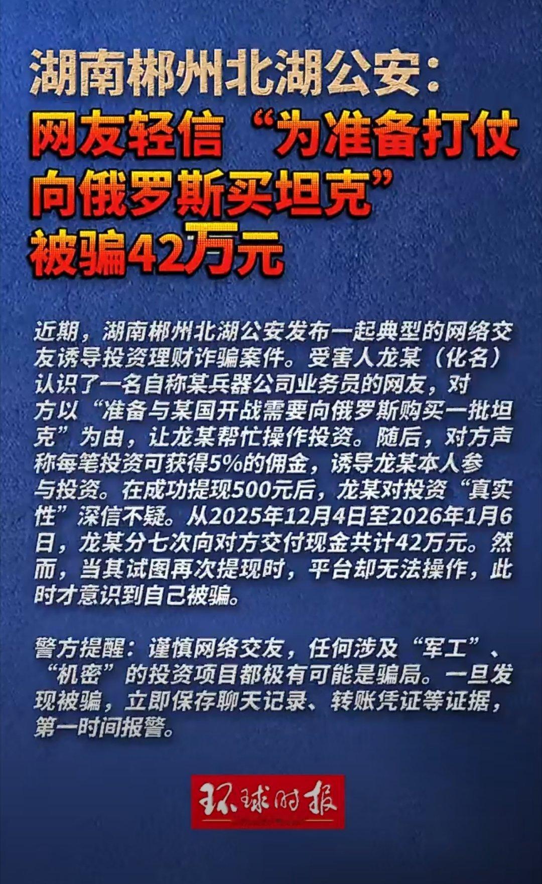 轻信“为准备打仗向俄罗斯买坦克”,受害人被骗42万元!近期,湖南郴州公安发布一起
