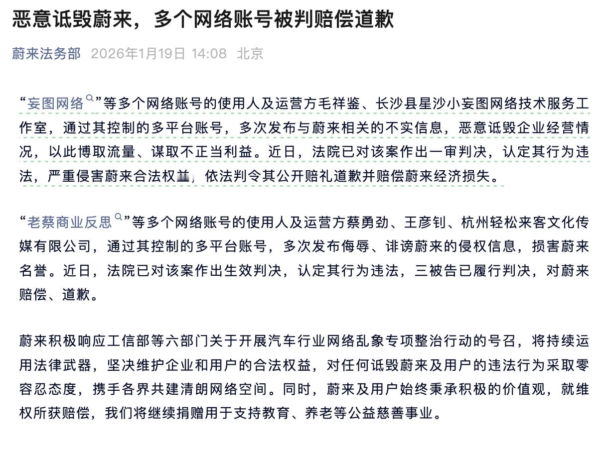 恶意诋毁蔚来!多个网络账号被判赔偿道歉