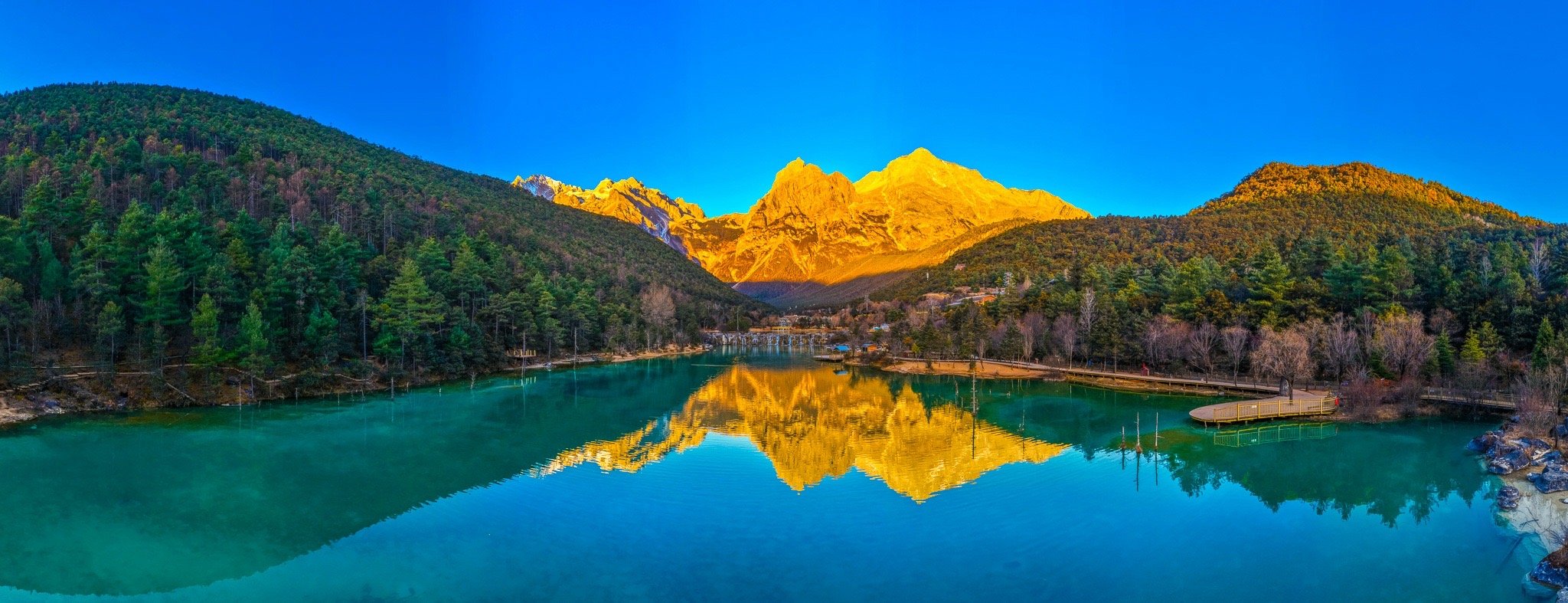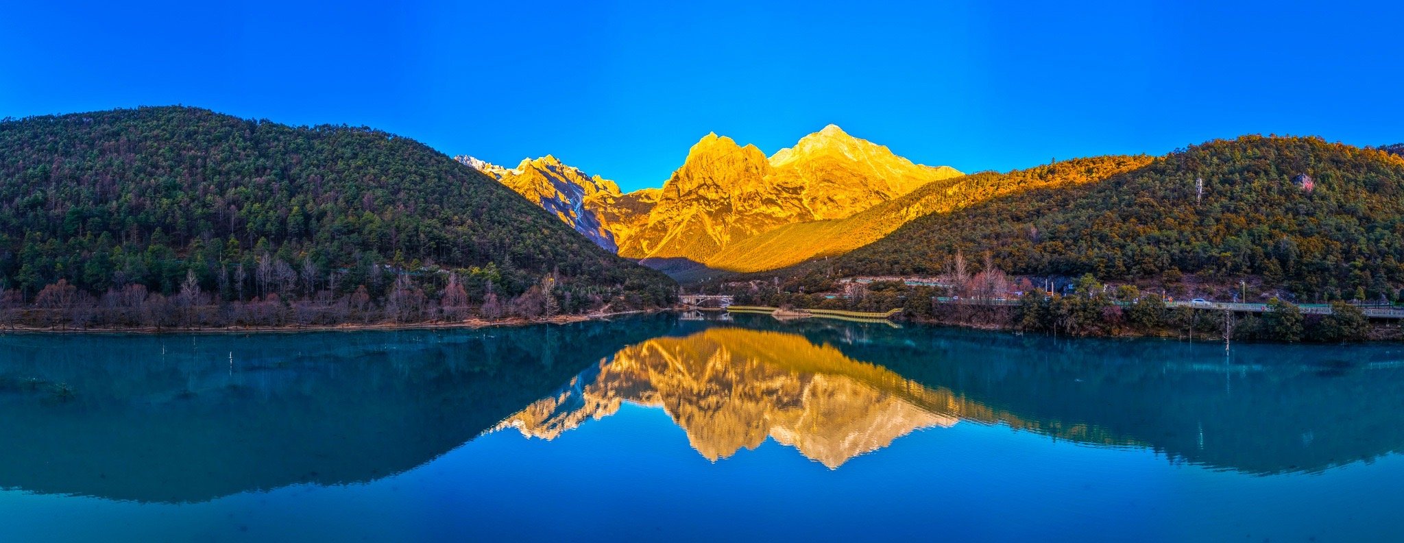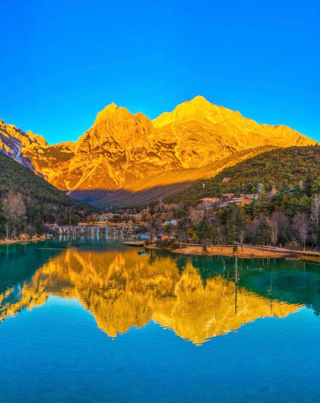 玉龙雪山冷暖撞色有多美 近日,摄影师在云南省丽江市蓝月谷,拍摄到了玉龙雪山“日照金山”美景。蔚蓝的湖水与金色的雪山同框,冷暖色调在大自然笔下完美交融。四季丽江冬游丽江