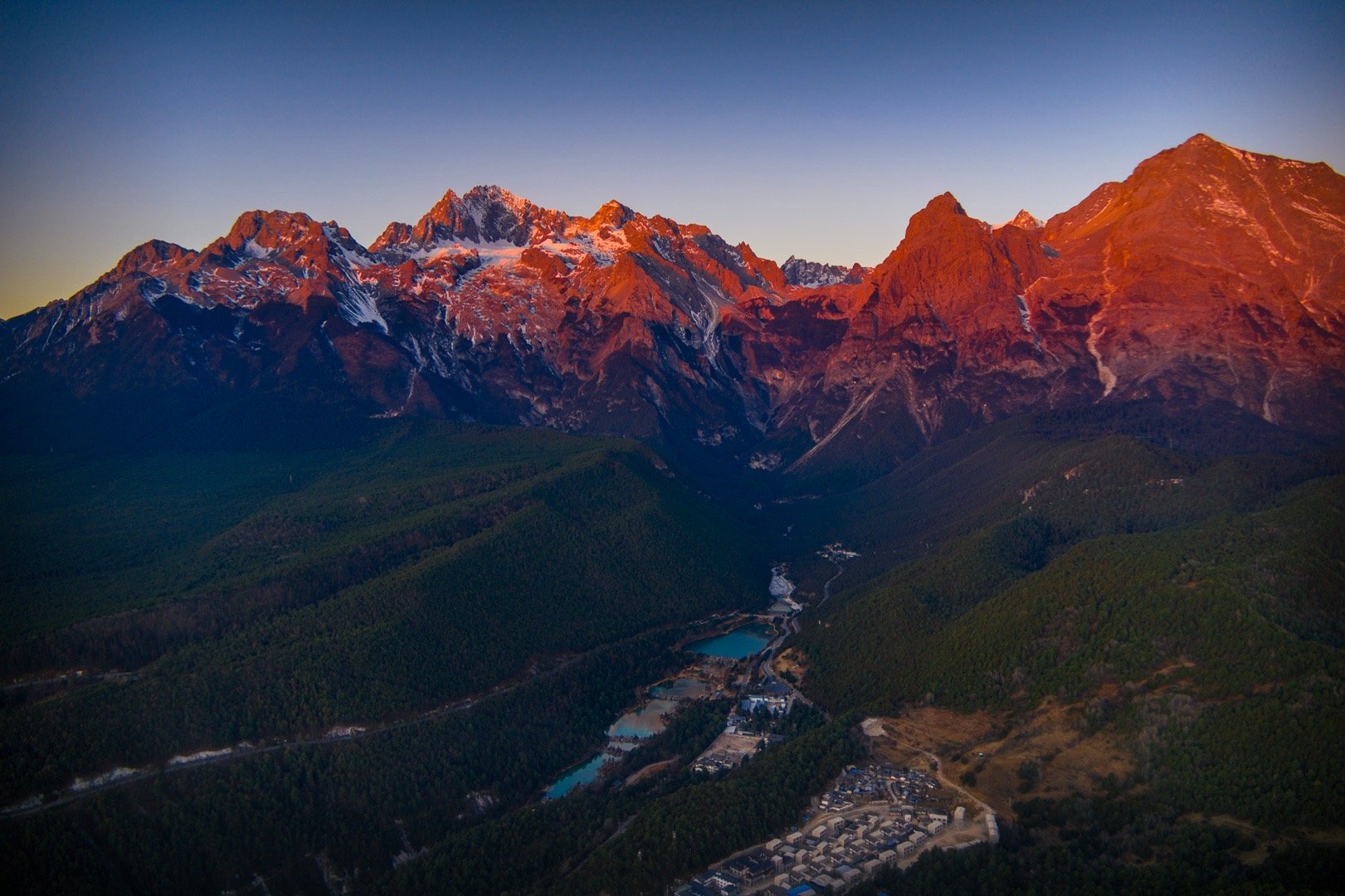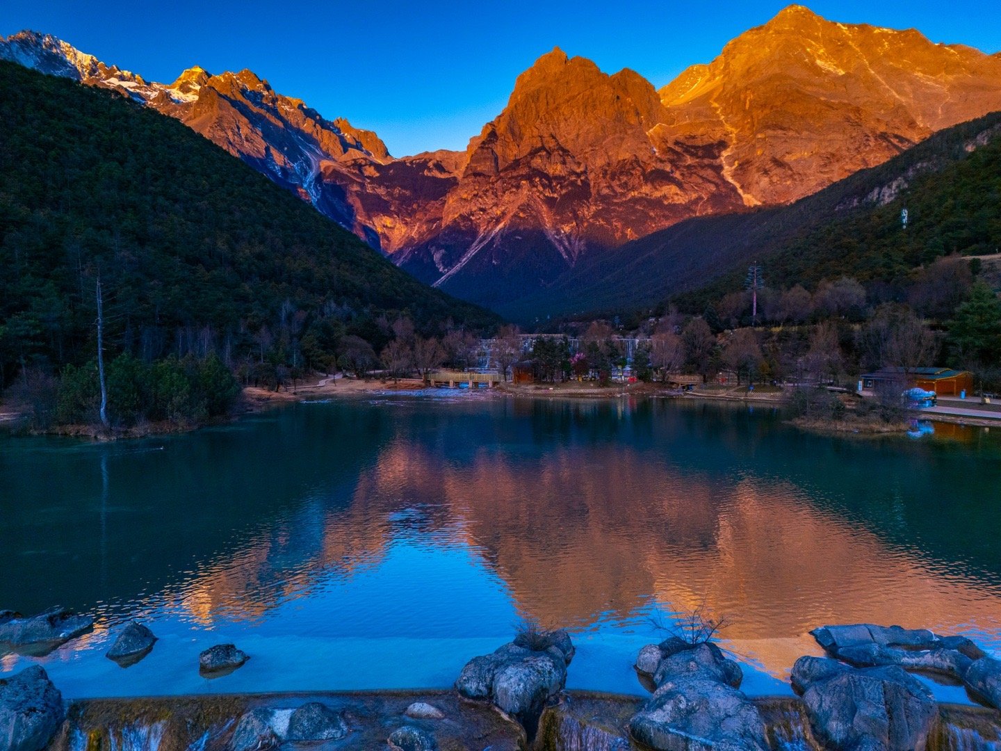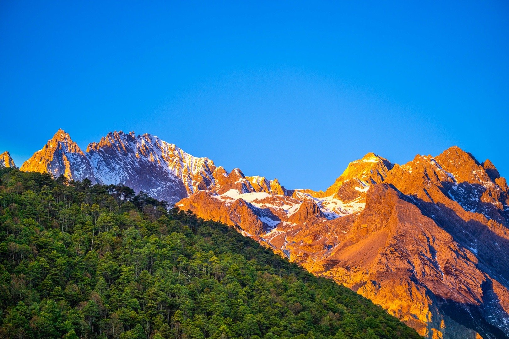 玉龙雪山冷暖撞色有多美 近日,摄影师在云南省丽江市蓝月谷,拍摄到了玉龙雪山“日照金山”美景。蔚蓝的湖水与金色的雪山同框,冷暖色调在大自然笔下完美交融。四季丽江冬游丽江