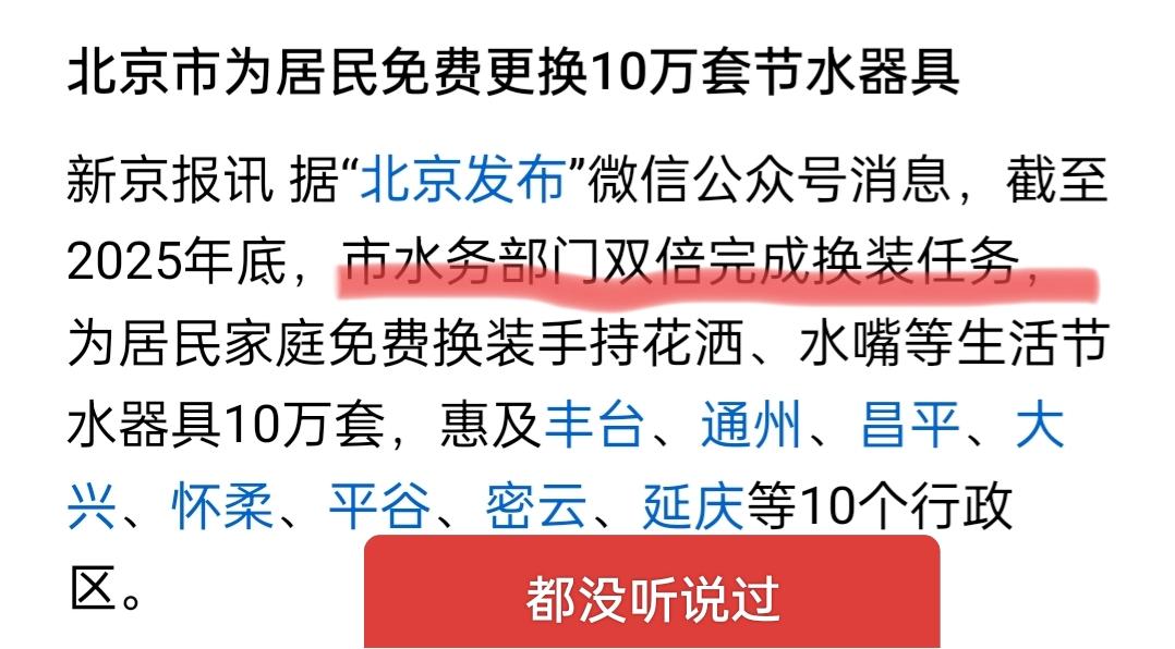 北京免费为居民更换10万套节水器具,市水务部门已双倍完成,不知道这20万套是如何分配的,有没有一个实施细则,听都没听说过这事,就更别说更换了! 这些节水器具是哪儿生产的?什么品牌?质量如何?发个商品链接,如果居民反应效果好的话,也方便大家购买!