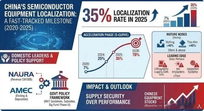 韩国媒体:中国半导体设备自给率超过35%!韩国商业邮报报道 :尽管美国实施了严格的出口管制,中国半导体设备的国产化率已超过35% ,标志着中国迈向技术自主化的一个转折点。这一成就提前实现了中国政府最初设定的30%的目标,体现了“制裁悖论” :美国的制裁实际上促进了中国半导体生态系统的自主发展。从2020年开始的7%,五年提升五倍到35%。按媒体曝光,去年底已经达到50%。也就是说2026年应该在50%以上,这绝对是好消息。比预期要快。如果2027我们解决光刻机的话,大概国产率会达到90%以上,卡脖子成为历史了。
