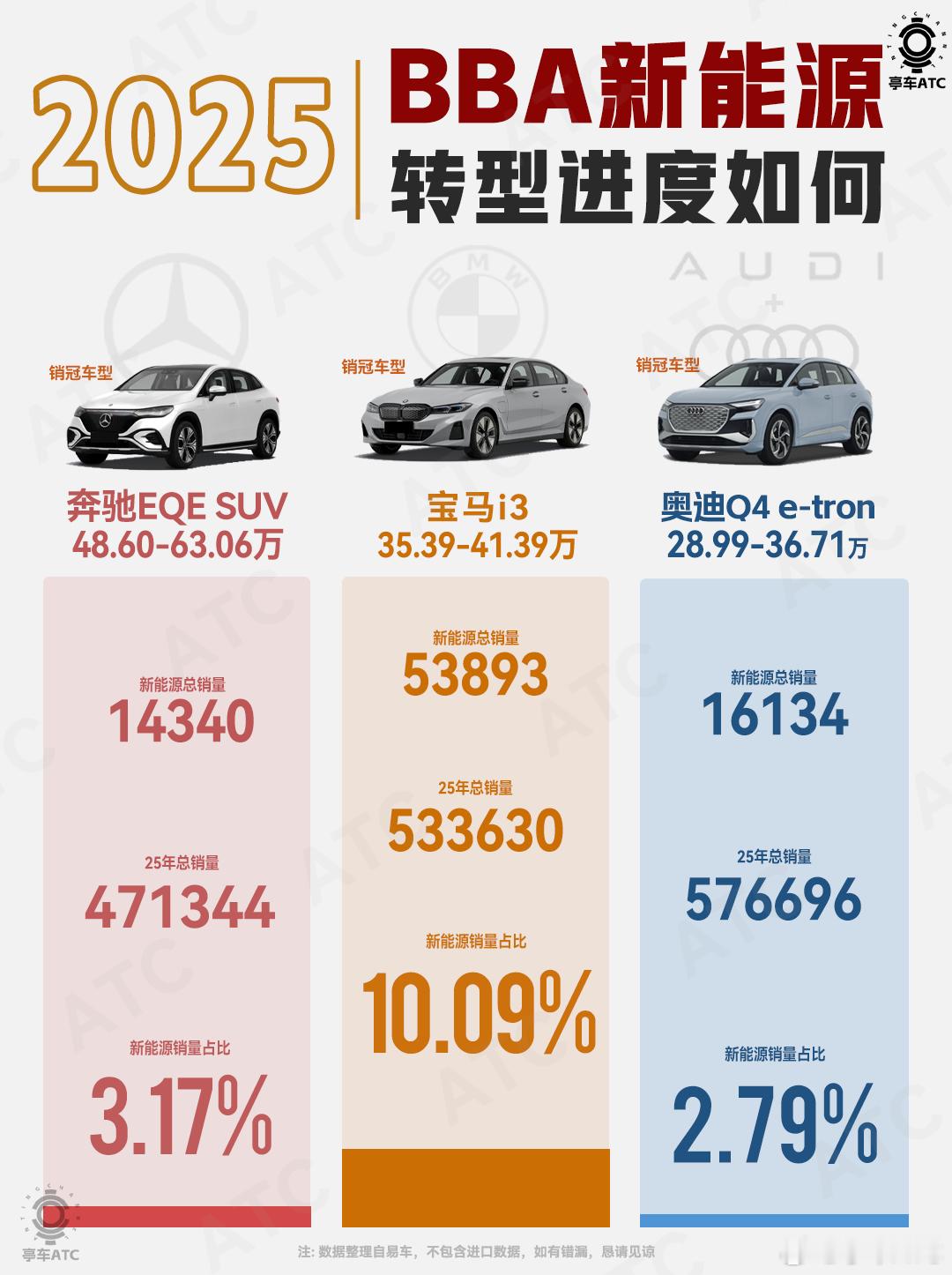 从2025年BBA的新能源成绩单里,我们看到的不仅是销量数字,更是传统豪华品牌在电动化赛道上扎实迈进的步伐。作为全球豪华车市场的标杆,BBA的转型节奏虽不算激进,但每一步都在为未来的厚积薄发筑牢根基。宝马无疑是2025年的亮点,53893辆新能源销量、10.09%的占比,不仅是三家首个突破10%的品牌,更印证了其“以用户需求为核心”的电动化策略初显成效。宝马i3以35万级定价精准切入豪华电动轿车的走量区间,凭借品牌口碑和驾控基因,成功吸引了一批追求豪华质感又想尝鲜电动的用户,为后续车型积累了宝贵的市场经验。奔驰和奥迪也在各自的赛道上稳步探索:奔驰EQE SUV以48.6万起的定价坚守高端电动豪华定位,凭借三叉星徽的品牌底蕴和舒适豪华的产品特质,在高端市场站稳了脚跟;奥迪Q4 e-tron下探至28.99万起的价格,用更亲民的姿态吸引年轻用户,为品牌电动化普及打下基础。尽管目前3%左右的新能源占比看似不高,但这种“高低搭配”的产品布局,正是BBA在电动化初期打磨体系能力的必经阶段。更值得期待的是2026-2027年的技术与产品爆发:宝马基于Neue Klasse平台的新世代车型将正式交付,800V高压架构、全栈自研的电驱系统将带来更极致的续航与性能;奔驰MB.EA纯电专属平台将落地中大型车产品线,全新电动SUV车型将重塑豪华电动出行体验;奥迪PPE平台的旗舰车型也将登场,以更高的智能化水平和品牌辨识度冲击高端市场。依托百年积淀的品牌力、成熟的全球供应链体系,以及对豪华用户需求的深刻理解,BBA的电动化转型绝非“试水”,而是一场有备而来的升级。2025年的积累,正是为了2026-2027年的全面发力,我们有理由相信,传统豪华品牌的电动化浪潮,将在未来两年为市场带来更多惊喜。大v聊车