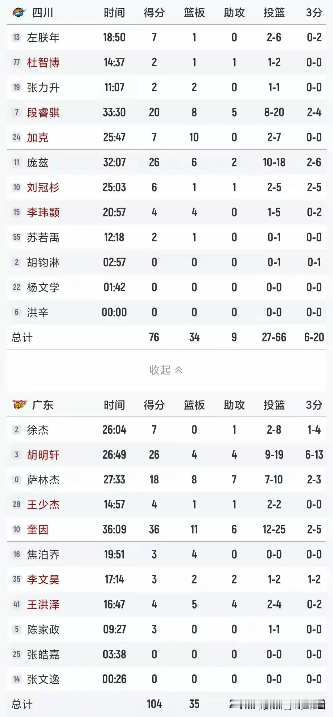 广东队104-76战胜四川队,让我们看清三个事实。 1、杜峰对胡明轩真是太好了!