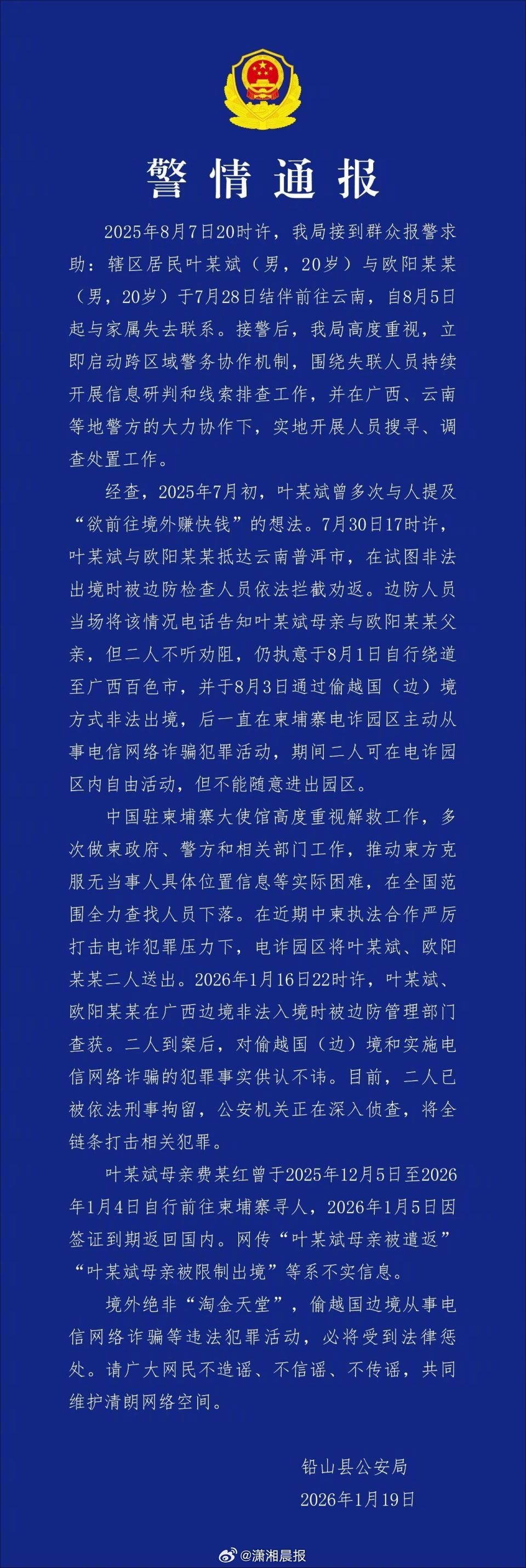 【#警方通报江西小伙疑被卖至柬埔寨#】 2026年1月19日,铅山县公安局发布警情通报:2025年8月7日20时许,我局接到群众报警求助:辖区居民叶某斌(男,20岁)与欧阳某某(男,20岁)于7月28日结伴前往云南,自8月5日起与家属失去联系。接警后,我局高度重视,立即启动跨区域警务协作机制,围绕失联人员持续开展信息研判和线索排查工作,并在广西、云南等地警方的大力协作下,实地开展人员搜寻、调查处置工作。经查,2025年7月初,叶某斌曾多次与人提及“欲前往境外赚快钱”的想法。7月30日17时许,叶某斌与欧阳某某抵达云南普洱市,在试图非法出境时被边防检查人员依法拦截劝返。边防人员当场将该情况电话告知叶某斌母亲与欧阳某某父亲,但二人不听劝阻,仍执意于8月1日自行绕道至广西百色市,并于8月3日通过偷越国(边)境方式非法出境,后一直在柬埔寨电诈园区主动从事电信网络诈骗犯罪活动,期间二人可在电许园区内自由活动,但不能随意进出园区。中国驻柬埔寨大使馆高度重视解救工作,多次做柬政府、警方和相关部门工作,推动柬方克服无当事人具体位置信息等实际困难,在全国范围全力查找人员下落。在近期中柬执法合作严厉打击电诈犯罪压力下,电许园区将叶某斌、欧阳某某二人送出。2026年1月16日22时许,叶某斌、欧阳某某在广西边境非法入境时被边防管理部门查获。二人到案后,对偷越国(边)境和实施电信网络诈骗的犯罪事实供认不讳。目前,二人已被依法刑事拘留,公安机关正在深入侦查,将全链条打击相关犯罪。叶某斌母亲费某红曾于2025年12月5日至2026年1月4日自行前往柬埔寨寻人,2026年1月5日因签证到期返回国内。网传“叶某斌母亲被遣返”“叶某斌母亲被限制出境”等系不实信息。境外绝非“淘金天堂”,偷越国边境从事电信网络诈骗等违法犯罪活动,必将受到法律惩处。请广大网民不造谣、不信谣、不传谣,共同维护清朗网络空间。 江西