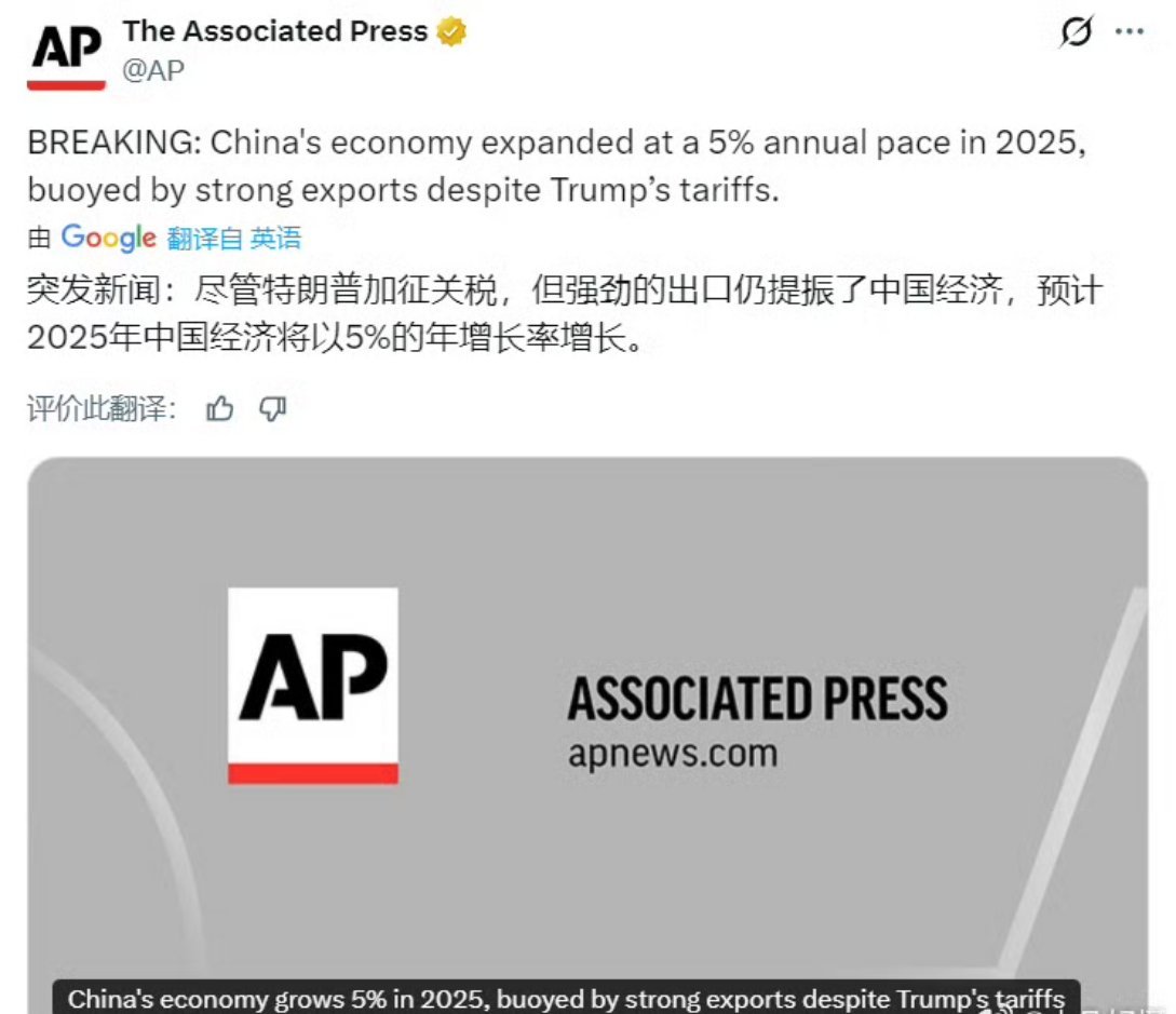 美联社:尽管特朗普加征关税,但强劲的出口仍提振了中国经济,预计2025年中国经济将以5%的年增长率增长。