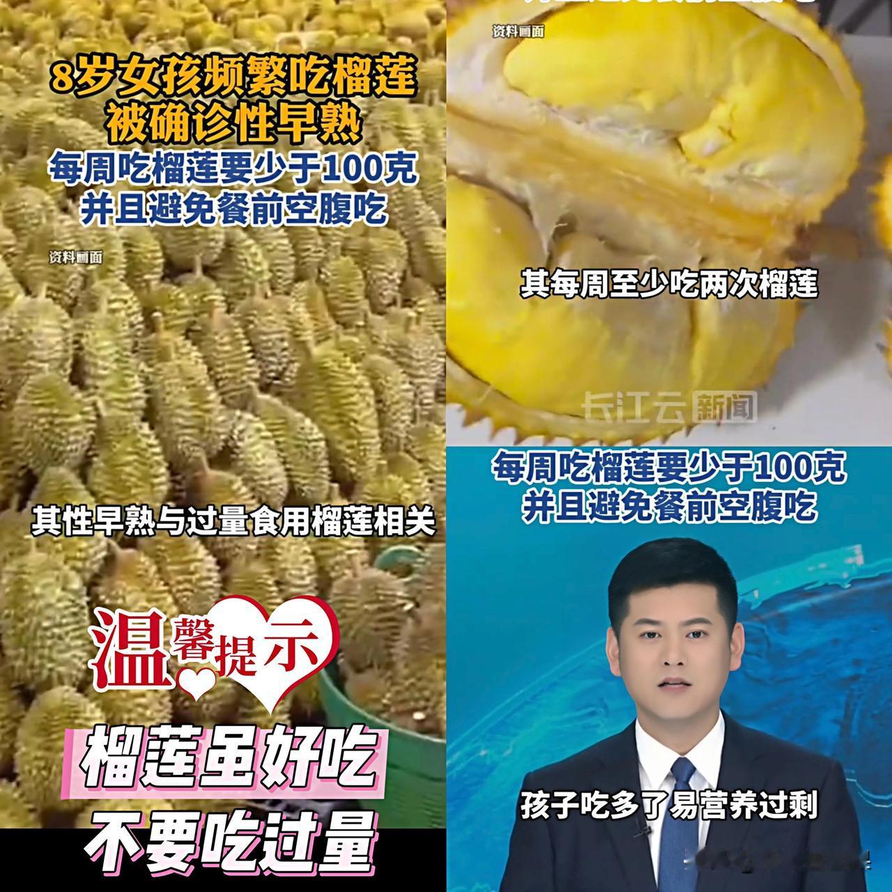 我滴个亲娘哎!榴莲居然成了“催熟神器”? 最近刷到个新闻直接给我整懵了:一个8岁的小丫头,就因为每周雷打不动至少炫两次榴莲,居然被查出来性早熟了! 医生说了,榴莲虽说叫水果之王,营养是挺足,但架不住糖分和热量高得离谱! 小孩儿的内分泌还没发育好呢,总这么大量吃,容易刺激激素乱分泌,搞不好就性早熟了。 医生特意叮嘱:娃每周吃榴莲别超100克,差不多就是小半块果肉的量,而且千万别空腹吃,不然对肠胃和内分泌都不好。 这事儿也给咱家长提个醒:给娃挑水果,不能光看营养够不够,适量才是王道! 像榴莲、芒果、荔枝这种高糖的,偶尔给娃解解馋行,可千万别由着他们猛吃。 毕竟跟一时的嘴瘾比起来,娃的健康才是顶顶重要的! 要是你家娃也馋榴莲,就按这个量来,可别好心办坏事,把“补营养”变成“伤身体”了!