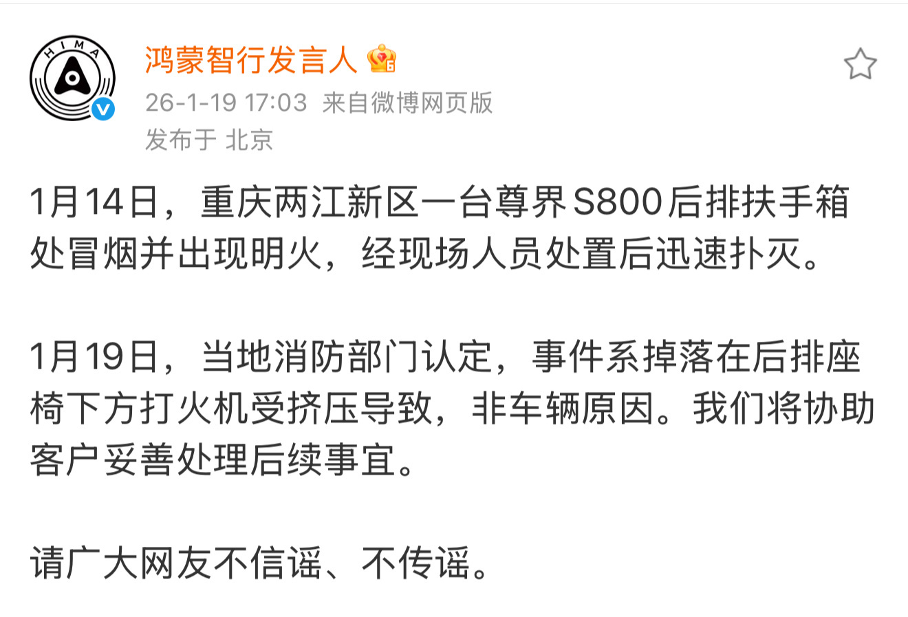 关于尊界S800重庆两江新区后排扶手箱冒烟并出现明火的官方说明,是掉落在后排座椅下方的打火机受挤压后导致。