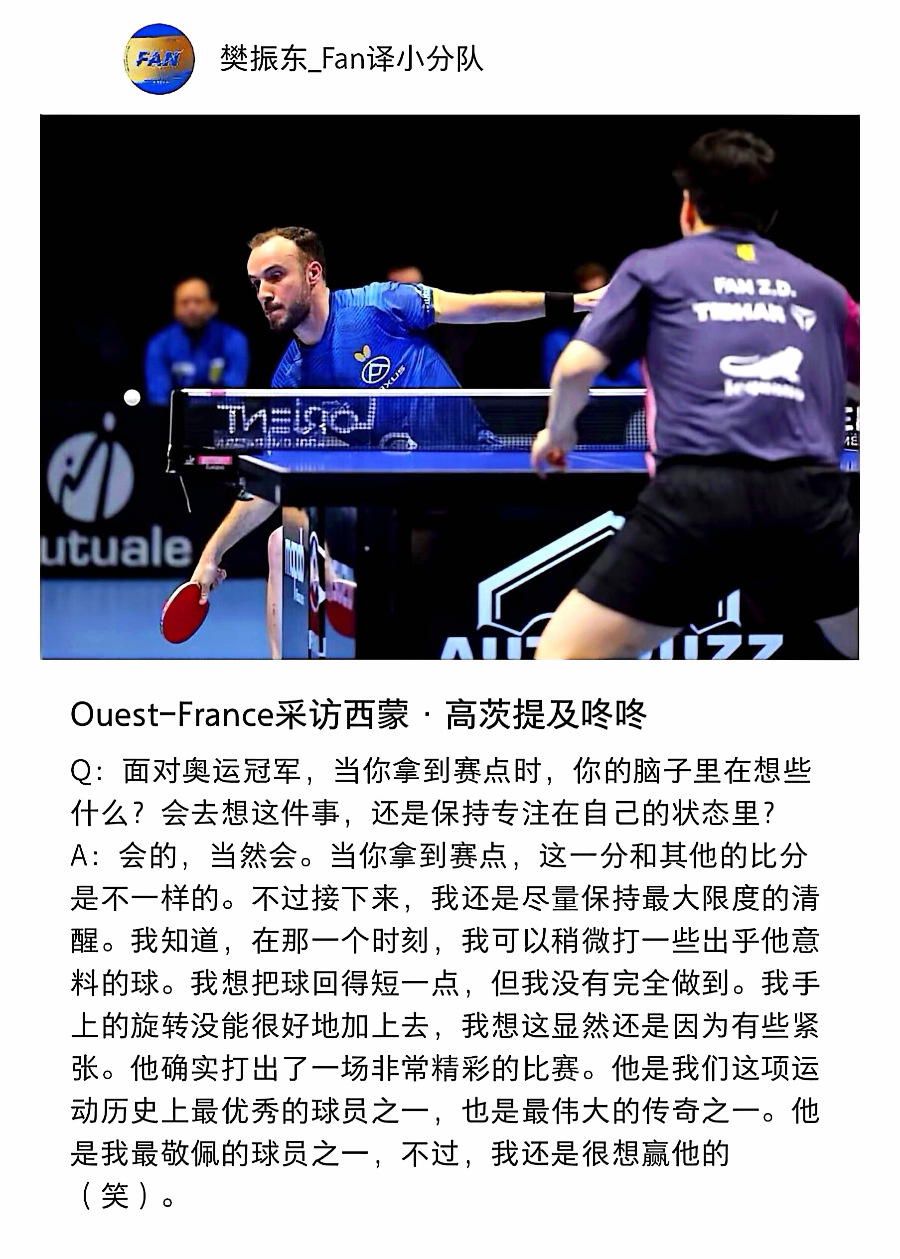 樊振东3比2逆转战胜高茨 西蒙·高茨欧冠1/4决赛后评价樊振东:“他是我们这项运动历史上最优秀的球员之一,也是最伟大的传奇之一,是我最敬佩的球员之一,不过,我还是很想赢他”。萨尔布吕肯3比0亨尼邦