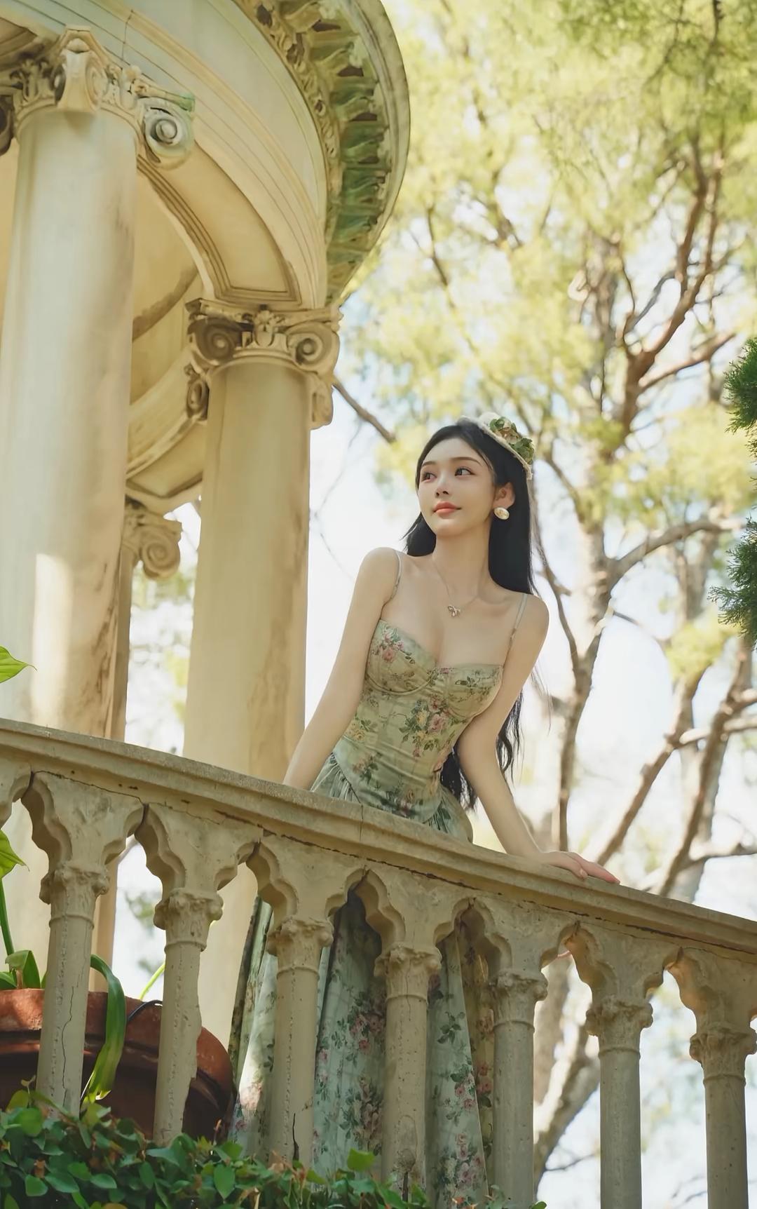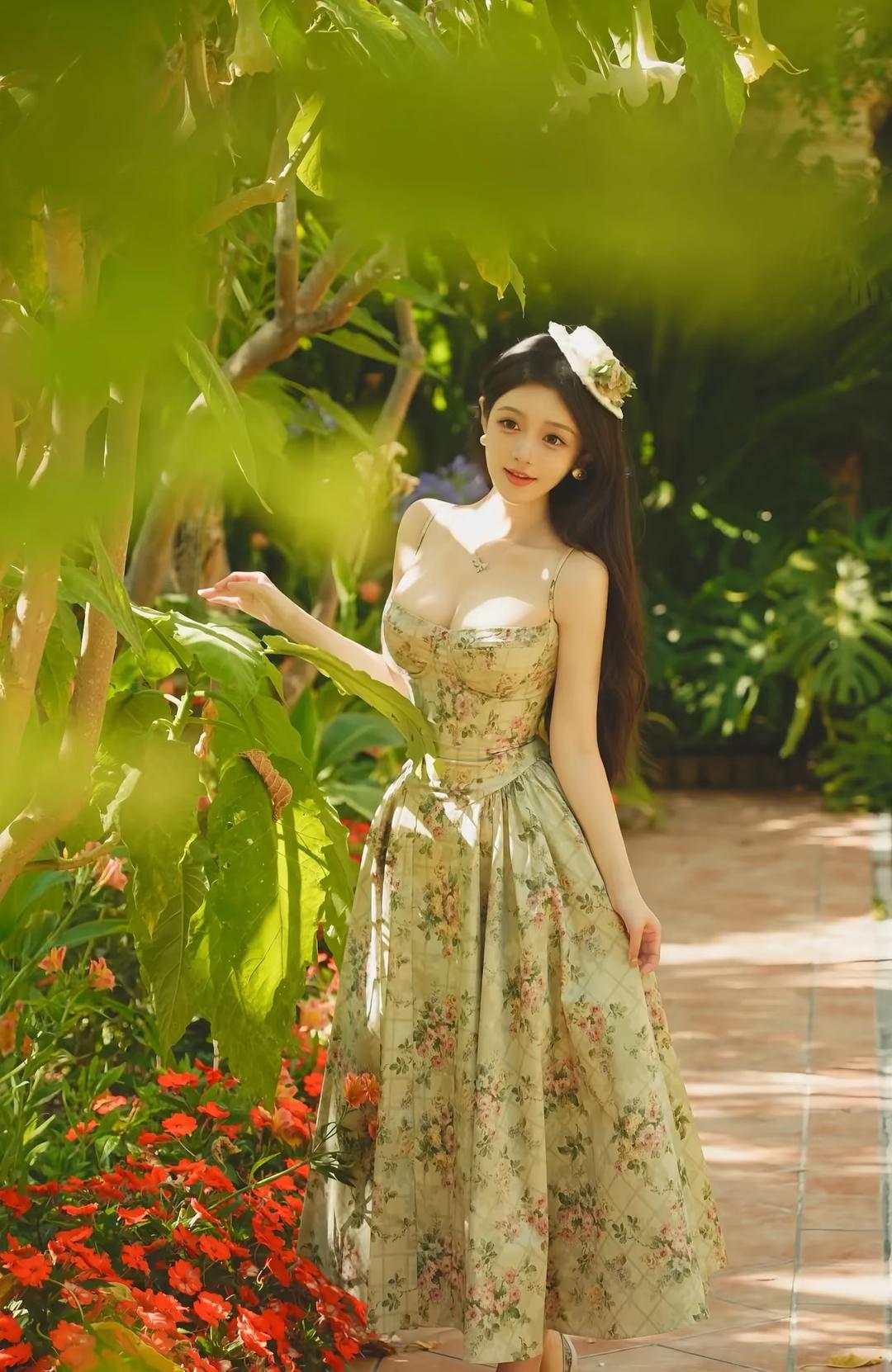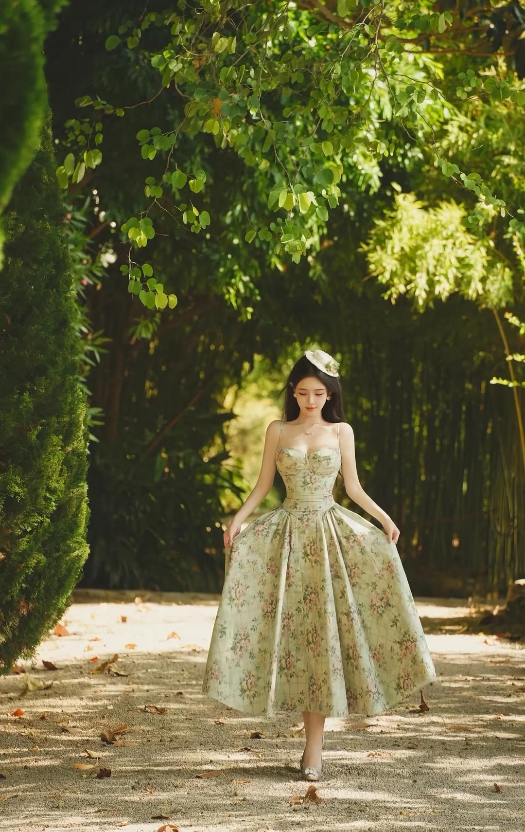 你身着的这件连衣裙,仿佛是月光下织就的仙子华服,轻盈的薄纱在微风中舞动,如同春日里最柔美的柳絮。裙摆上繁复的花卉图案,每一朵都像是从画中跃出,带着露珠的清新与晨曦的温暖。你头戴的那顶小礼帽,恰到好处地增添了几分优雅与神秘,让人不禁联想到童话中的公主。 你脚踏的高跟鞋,每一步都踏出了诗行,每一步都踏出了故事。你站在那片被阳光亲吻过的林间小径上,四周的绿意盎然,仿佛整个世界都在为你让路。你的笑容,如花般绽放,比这满园的春色还要动人。你就是这幅画中最美的风景,是这诗篇中最动人的篇章。