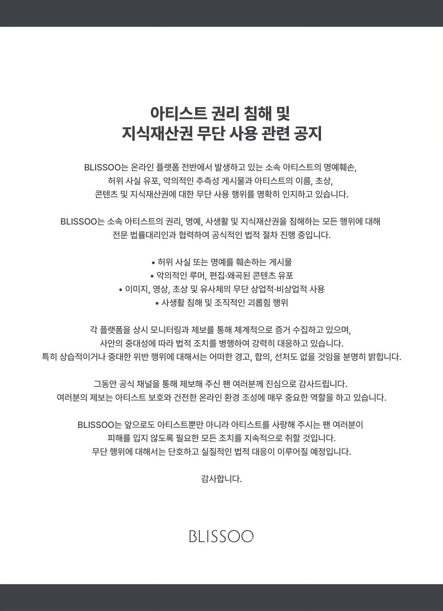 金智秀公司发布告黑声明金智秀公司告黑 关于侵权、诽谤及未经授权使用的官方声明BLISSOO 已发现,在各网络平台上持续存在针对我方艺人姓名、肖像、内容及知识产权的诽谤、虚假信息、恶意揣测及未经授权使用行为。BLISSOO 已联合专业法律顾问启动正式法律程序,以处理所有侵犯我方艺人权利、名誉、隐私及知识产权的行为,包括但不限于:• 诽谤或虚假陈述• 恶意谣言或编造内容• 以商业或非商业目的,未经授权使用艺人的图片、视频或肖像• 侵犯隐私及协同性骚扰BLISSOO 正在系统地收集和保存证据,并持续监控相关平台。对于反复、情节严重或造成实质损害的违规行为,BLISSOO 将不发出事前警告、不进行和解协商,也不会给予任何形式的宽大处理。匿名、使用假名或通过中介账户操作,均不能免除个人或实体的法律责任。任何参与制作、传播、复制或放大非法或有害内容的一方,都将承担全部法律责任。通过我方官方举报渠道收到的报告,将被正式审核,并可能作为证据收集和法律程序的一部分。此类配合为执法行动提供了实质性支持,也有助于根据适用法律保护艺人的权益。BLISSOO 将继续采取所有必要且适当的措施,依据适用法律维护艺人和其支持者的合法权益。任何未经授权、非法或侵权行为,都将通过迅速且果断的法律行动予以处理,相关责任方将被追究全部责任。kimjisoo