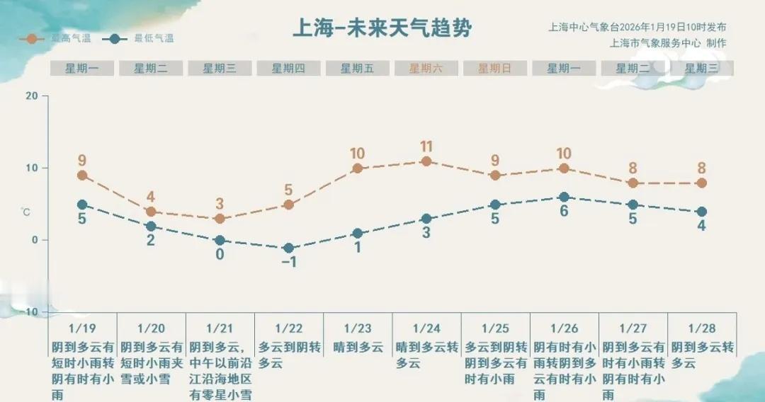 【“冰箱”级体验!申城本周雨雪“低温套餐”已派送→】受北方南下的强冷空气影响,今天(1月19日)申城维持阴到多云有短时小雨,下午转阴有时有小雨,今天半夜前后转小雨夹雪或小雪。北到东北风4~5级阵风6级,沿江沿海地区5级阵风6~7级,今天中午起5级阵风6~7级,沿江沿海地区6级阵风7~8级。白天升温乏力,气温在5~9℃之间,相对湿度90%~70%。网页链接