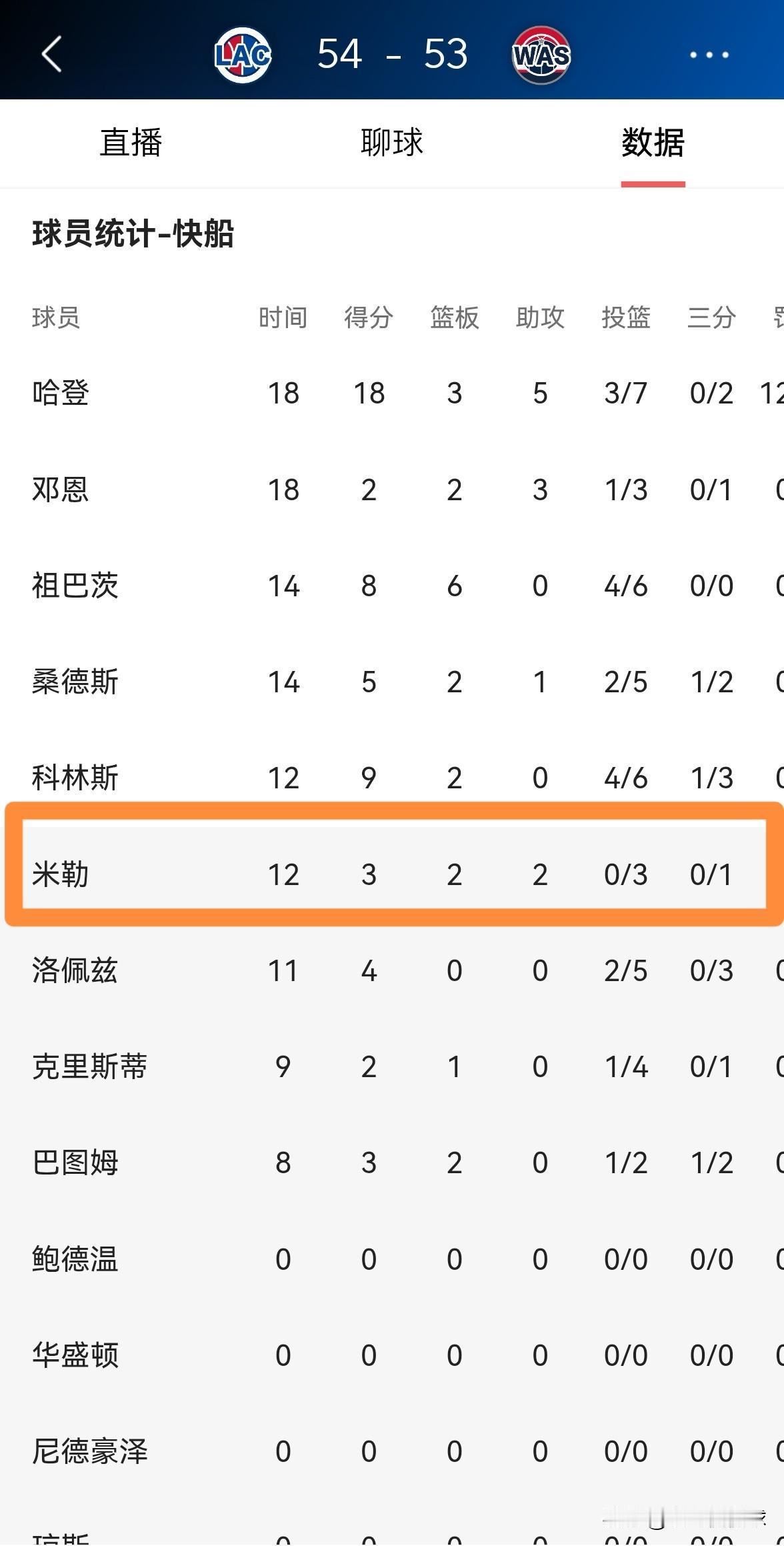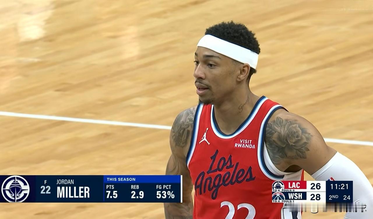 快船新星乔丹-米勒终于发挥低迷了!在今天快船客场挑战奇才的比赛中,目前双方半场战罢,快船以54:53领先对手1分。在前两节比赛中,米勒未能延续最近一段时期的好状态,他在替补出战的12分钟里,投篮3中0仅仅依靠罚球得到3分。 在快船当家球星伦纳德因伤缺阵的情况下,米勒原本应该成为哈登身旁最得力的助手之一,然而从米勒在上半场比赛中的表现来看,他没有做到。