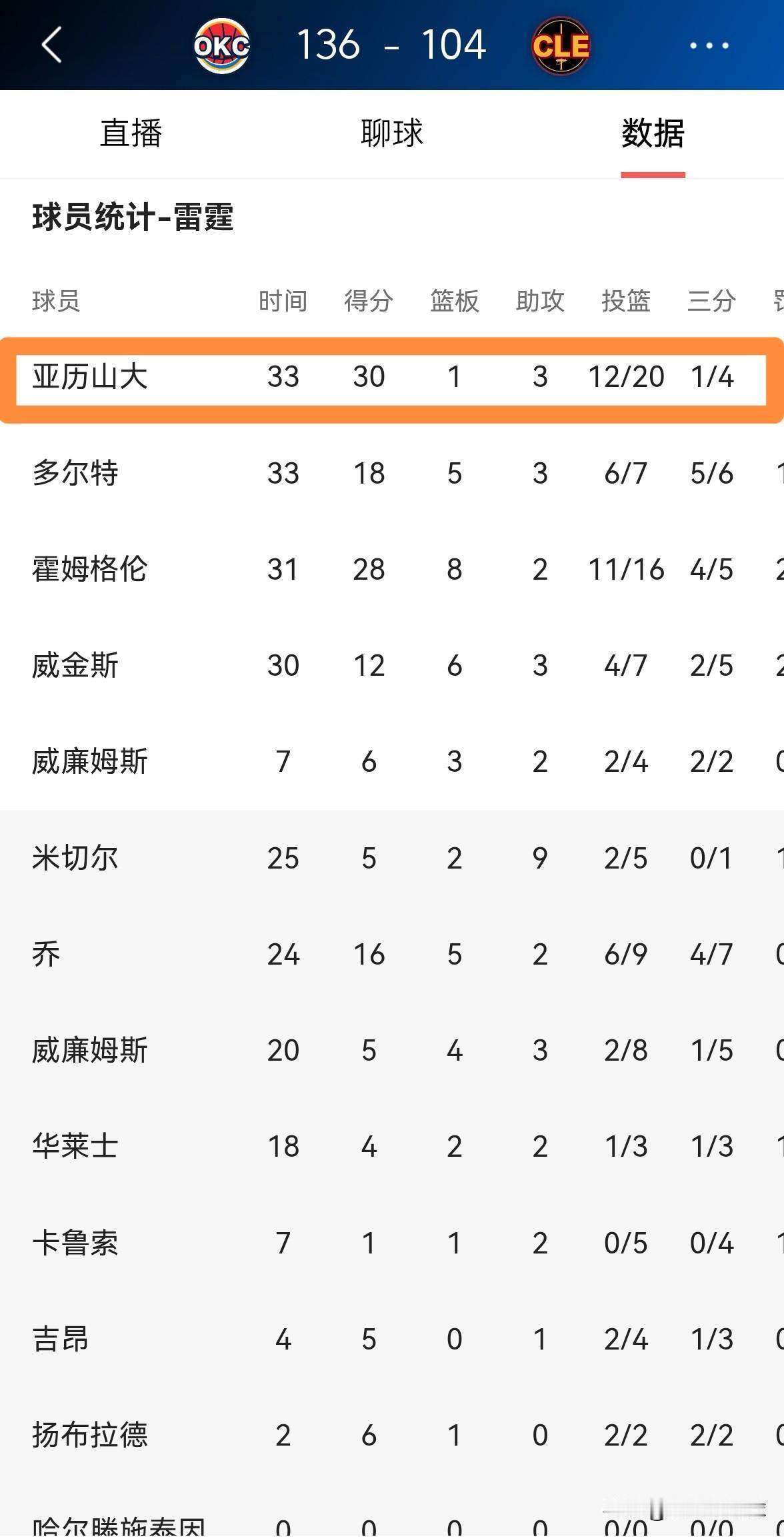 雷霆巨星亚历山大的得分能力真是让人佩服!在今天雷霆客场以136:104大胜骑士的比赛中,亚历山大视得分如探囊取物一般,他在首发出战的33分钟里,投篮20中12,其中三分球4中1、罚球5中5非常高效的砍下30分,还有3助攻1抢断2盖帽,没有出现任何的失误,他的场上正负值为+17。 作为当今NBA最强得分手之一,亚历山大可谓是攻防一体,他不仅拥有极其全面的进攻技术,而且具备非常强的防守能力。