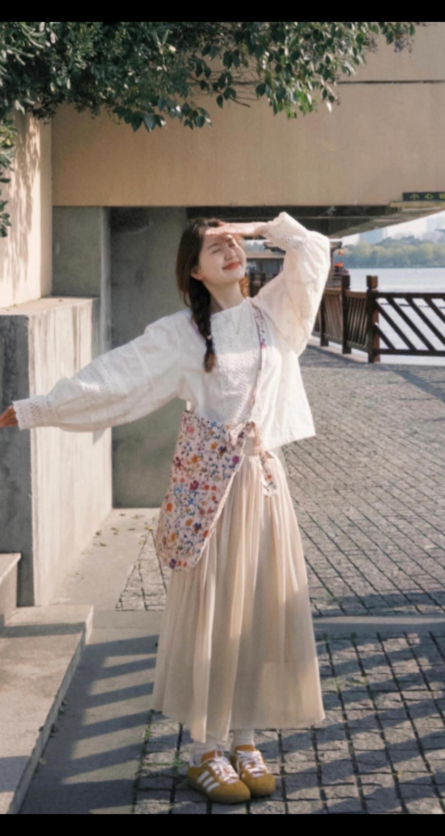 晴湖白衫漾温柔晴日的阳光落在湖面,碎成粼粼的光斑,白色翻领短款上衣带着清爽