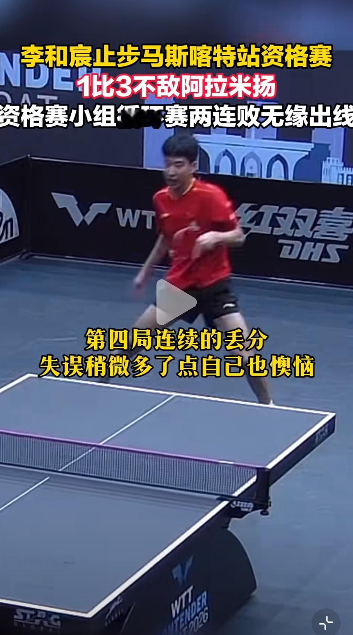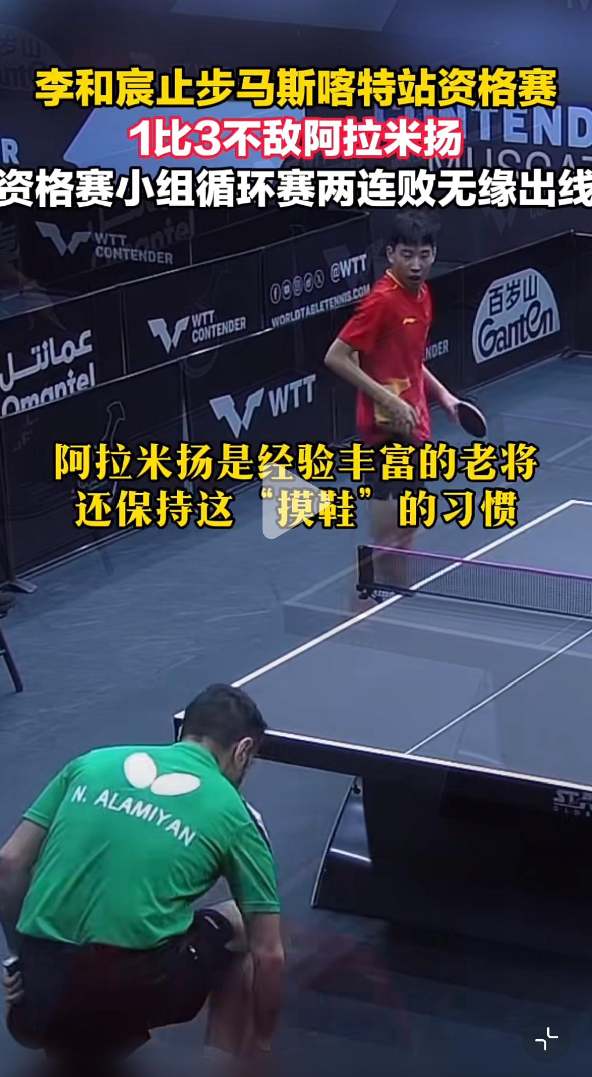 国乒小将李和宸1:3不敌老将阿拉米扬止步马斯喀特站资格赛 1月20日,17岁国乒小将李和宸 在马斯喀特常规挑战赛资格赛中 两连败,遗憾止步资格赛! 李和宸是世青赛四冠王, 此次马斯喀特站, 1:3不敌队友徐海东, 连败两场资格赛, 无缘出线,晋级正赛! 资格赛是循环赛, 机会其实挺大的, 阿拉米扬不好打, 非常难缠, 一般选手心态不稳的都打不了这个外协,输赢都是一肚子火! 李和宸还没有在U19毕业, 打成人赛输了也是交学费, 涨经验, 小将继续努力加油👏, 机会还会有,加油!
