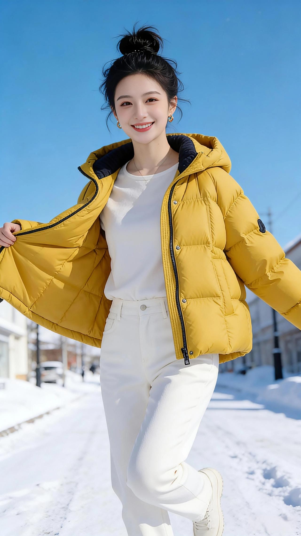 冬阳里的明黄 雪后的街是被揉碎的糖霜,铺得整整齐齐。风掠过耳尖时,她正迎着光走来,明黄色的羽绒服像一小团跳跃的暖阳,把冬日的清寒都焓得软和了些。 丸子头松松挽在头顶,露出一截纤细的脖颈,阳光落在她笑弯的眼尾,碎成星子。她把羽绒服的拉链拉开半幅,米白内搭衬得肤色愈发莹润,行走时衣摆轻轻晃动,像衔着风的蝶翼。偶尔抬手拢一拢领口,黑色包边与明黄面料撞出利落的层次,袖口的小标在雪光里闪着细腻的光。 街角的雪堆还留着昨夜的轮廓,她却像把春天穿在了身上。笑意漫过眉梢时,连路过的风都放缓了脚步。明黄在素白天地里泼洒出鲜活的笔触,原来最动人的冬景,从不是雪落满枝桠,而是有人带着一身暖意,笑着向你走来。 高级感穿搭 新年穿搭 冬季穿搭 棉衣棉服