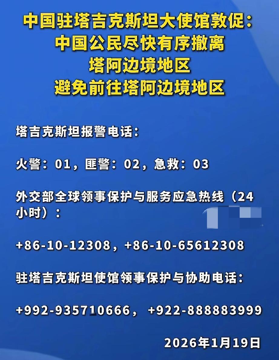 最新消息! 塔吉克斯坦与阿富汗边境冲突极有可能再升级! 塔吉克斯坦和阿富汗边境那边,战火眼看就要烧起来了!咱们中国驻塔使馆急忙提醒:所有在塔的同胞,尤其是住在两国边境附近的人,马上联系使馆登记后撤离! 从现场发回的照片能看到,边境上聚集了好多武装人员,冲突随时都可能打起来。有在当地的中国同胞拍到坦克车队往边境开的画面,让人心里发紧,空气里都透着一股紧张的味儿。使馆24小时领保热线已经启动了应急方案,会安排包机把大家接回国。 “接到通知的时候手都一直在抖”,在杜尚别开超市的张先生说,现在正连夜收拾店里的账本,“东西都顾不上要了,命才是最重要的”。使馆的工作人员说,已经有一百多个人登记好了,第一批要撤离的名单今晚就能定下来。 这已经是这个月第三次发撤离提醒了。专家说,边境上的部落武装和政府军早就有矛盾了,最近恐怕会有大的冲突。快转发给在塔的亲友:平平安安比啥都重要,要是真有情况,记得第一时间联系使馆!