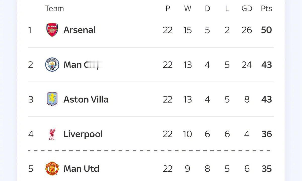 📢英超第22轮战罢,曼联目前排名联赛第5位。曼联