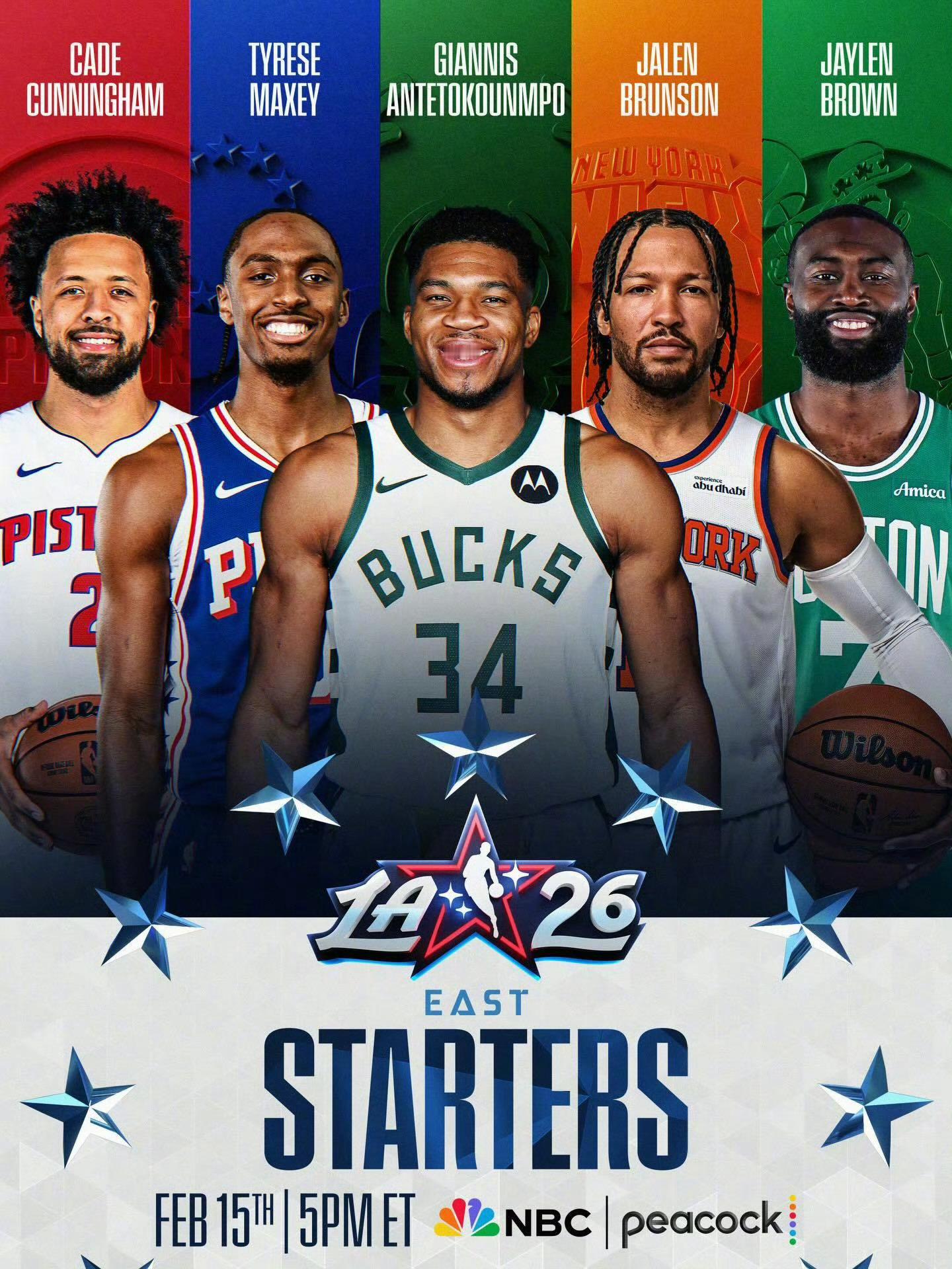 2026年的NBA全明星首发正式公布:——东部:字母哥、布伦森、坎宁安、杰伦布朗、马克西——西部:东契奇、亚历山大、文班亚马、库里、约基奇东契奇球迷票王,字母哥领衔东部,詹姆斯、杜兰特两位前NBA大小王全部无缘首发…2026NBA全明星东部首发2026NBA全明星西部首发詹姆斯连续21年入选全明星首发纪录终结