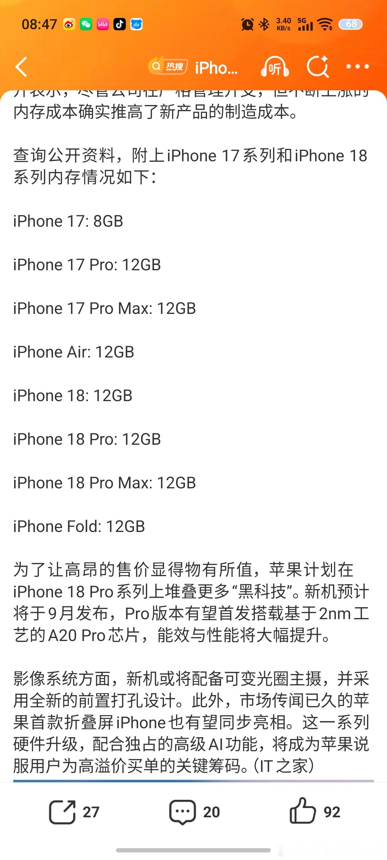 LH手机科技爱好者 iPhone18系列据说是要标配12GB内存,有消息称可能会涨价,但也有人说可能会保持原。现在没有准确的消息,主要是看产品升级大不大,标准版5999元起售的话我觉得合理,苹果的定价本来就不便宜了。iPhone18系列售价曝光