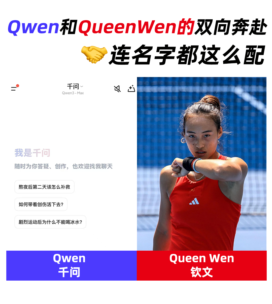 郑钦文找到了命中注定的代言郑钦文阿里千问全球代言人Qwen=Queen Wen,谐音梗这次赢麻了!这哪是巧合,分明是双向奔赴的顶级官宣!当郑钦文用球拍征服赛场,千问也以能打通生态、自主办事的AI助手身份刷新科技赛道。一个在球场锁定胜局,一个领跑全球科技趋势。这波不止是代言,是灵魂共鸣,是格局对齐,更是CP粉狂喜的顶级双A剧本!