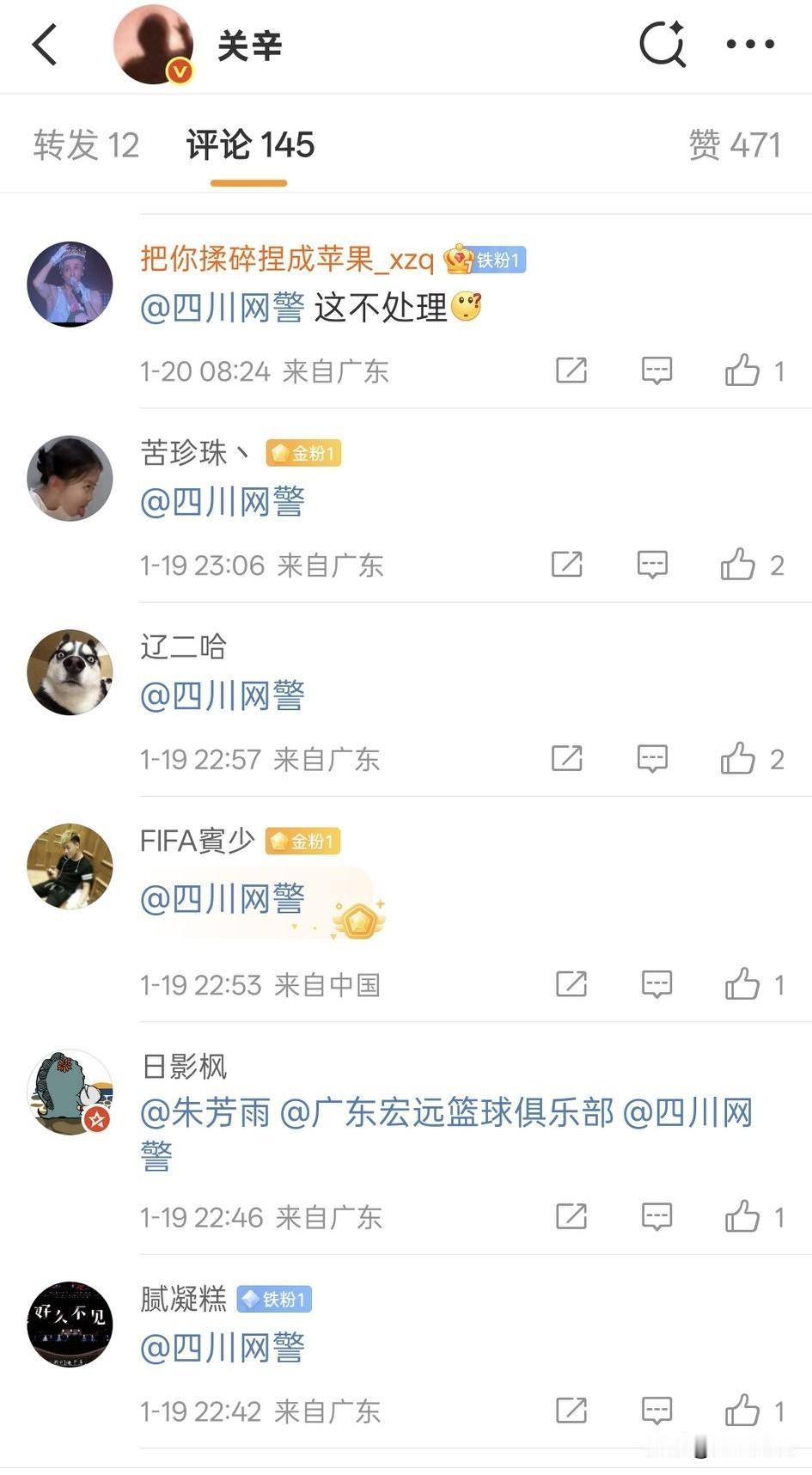 广东男篮球迷彻夜难眠在找警察叔叔,为啥? 昨天晚上,广东男篮在战胜本赛季弱旅四川男篮后,取得了进入CBA联赛30年来的第1000场胜利,可喜可贺。正如广东著名媒体人关辛社媒指出:广东宏远俱乐部在CBA的第一千场胜利虽迟但到,继续加油!就在这个节骨眼上,有网友留言:“然后,你们回去表演一个全员坠机庆祝一下?”这下可不得了,广东球迷炸锅了,从昨天晚上到今天早上,彻夜难眠纷纷在网上艾特网警。 网络是有记忆的。上赛季,山西汾酒男篮季后赛八进四以3-0淘汰广东男篮,其中一场比赛,山西汾酒男篮以123-81大胜广东42分,创造广东建队历史上输分第二多的分差时,广东一些极端球迷也是彻夜难眠,在多个媒体留言诅咒山西男篮球员堕J、山西发生矿N,表现出了口无遮拦、歇斯底里、丧失理智的疯狂之举。那个时候,也不见广东球迷去报网警主持公道。如今,被自己射出去的箭反噬一剑封喉才感觉到痛苦。要想自己家平安喜乐,首先自己要积德行善!求人不如求己,做人做事要正道,别走在双标的路上,那样会迷失自我。天道好轮回,苍天饶过谁!切记切记切记!