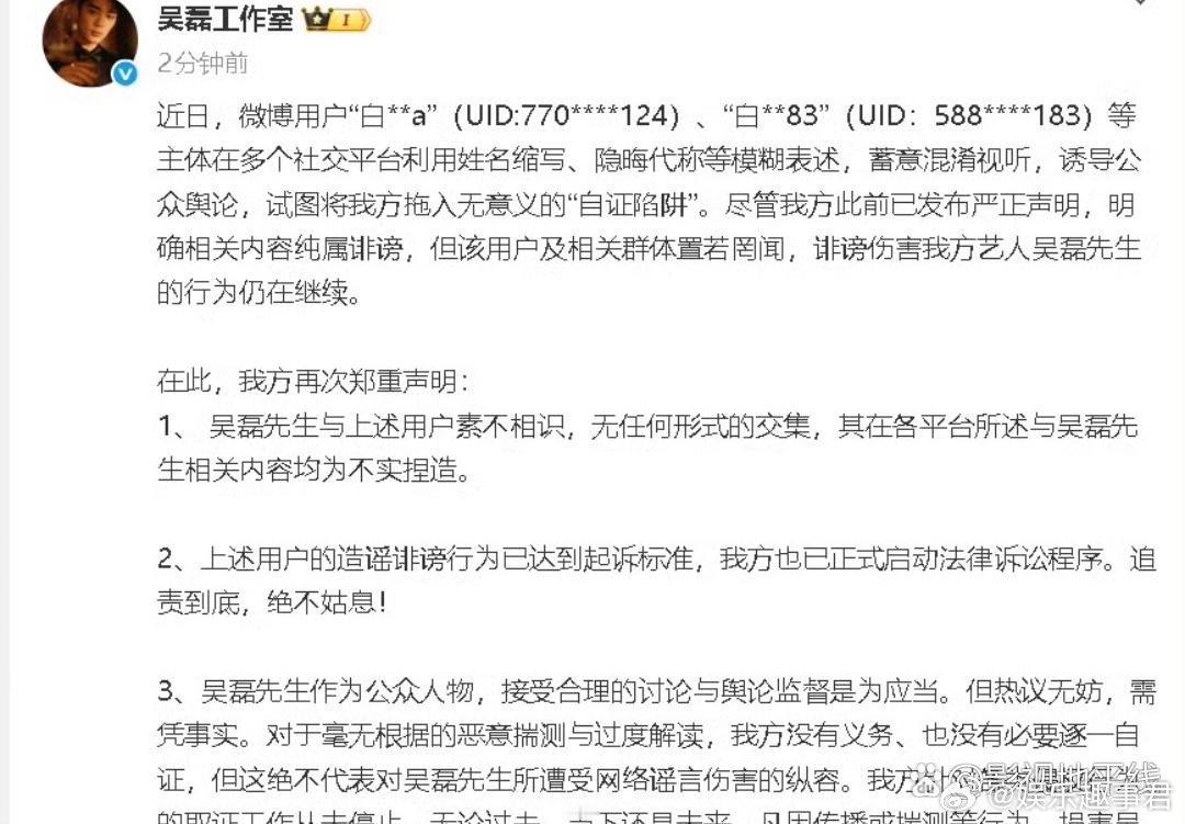 吴磊方称没有义务和必要逐一自证19日晚,吴磊工作室再次声明回应白珊珊诽谤事件,称与该用户素不相识,已正式启动对其造谣诽谤行为的法律诉讼程序。工作室称没有义务和必要对毫无根据的恶意揣测与过度解读逐一自证,但针对各类侵权必将通过法律途径追究到底。