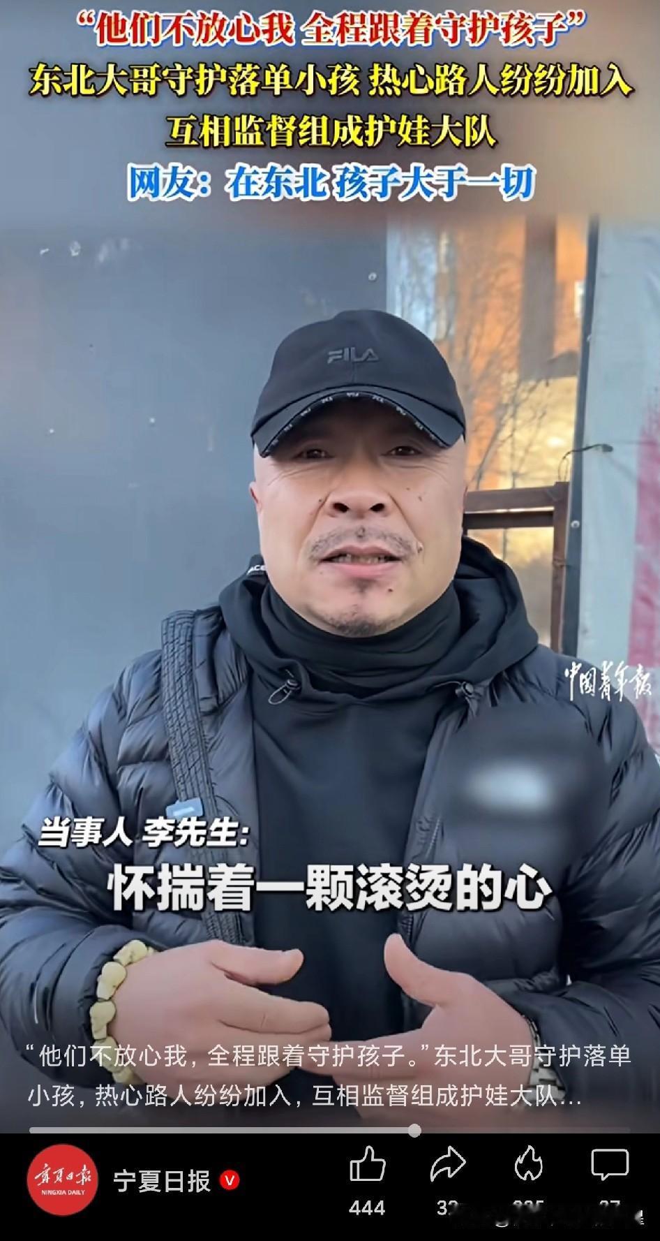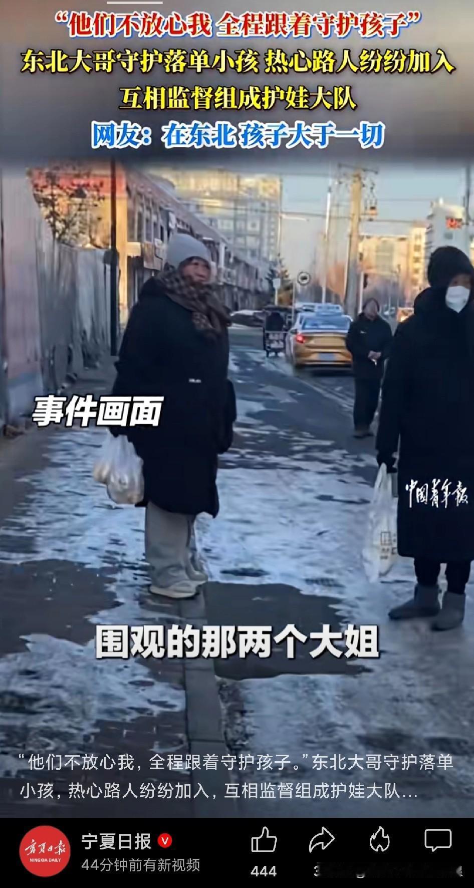 泪目!东北一位大哥发现小孩独自在外不放心,就一路守护,没想到路过的热心人纷纷加入,自发组成“护娃大队”互相监督,既护着孩子,又避免了误会。 为啥这事儿能暖到全网?说白了就是刻在东北人骨子里的热心肠,更懂“孩子是底线”这个理儿。 一个人守护怕误会,一群人监督既护了娃,也避了嫌。 咱普通人遇到落单小孩,别直接上手抱,先在远处守护,再喊周围人一起帮忙,既安全又暖心。 不光东北,咱全国都该有这股劲儿! 遇上孩子独自在外,别犹豫,搭把手、护一程,让每个娃都能平平安安回家!