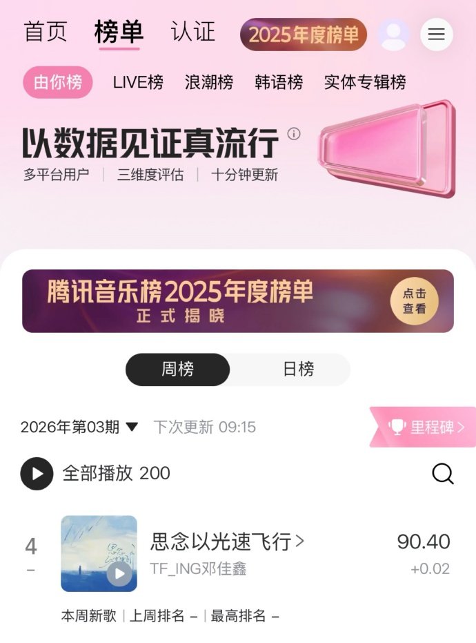 邓佳鑫新歌日榜top2 让我们恭迎新歌日榜top2思念以光速飞行大帝~
