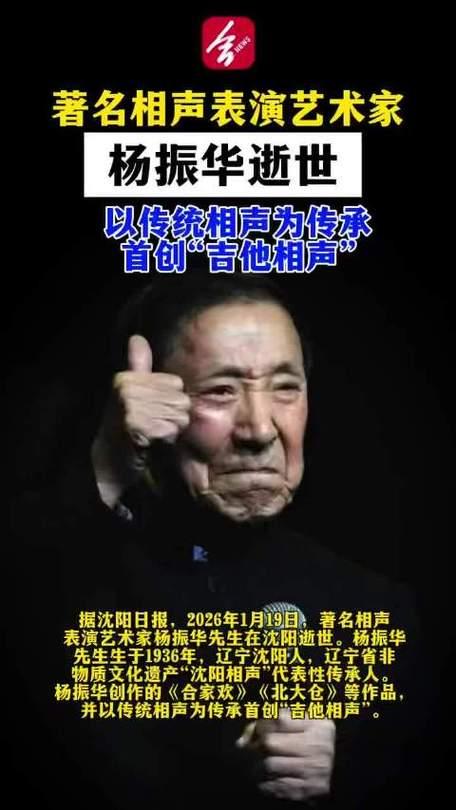 2026年1月19日,著名相声表演艺术家杨振华在沈阳逝世,享年90岁。他以《下棋》《动物世界》等讽刺佳作闻名,首创“吉他相声”,获中国曲艺牡丹奖终身成就奖。晚年仍活跃舞台,培养新人,为相声传承与创新倾尽心血。杨振华去世