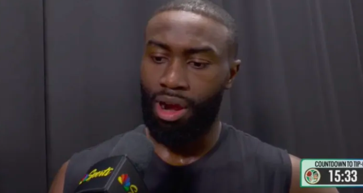 NBA常规赛,凯尔特人对阵活塞的比赛正在进行中。 凯尔特人球员杰伦-布朗赛前接受