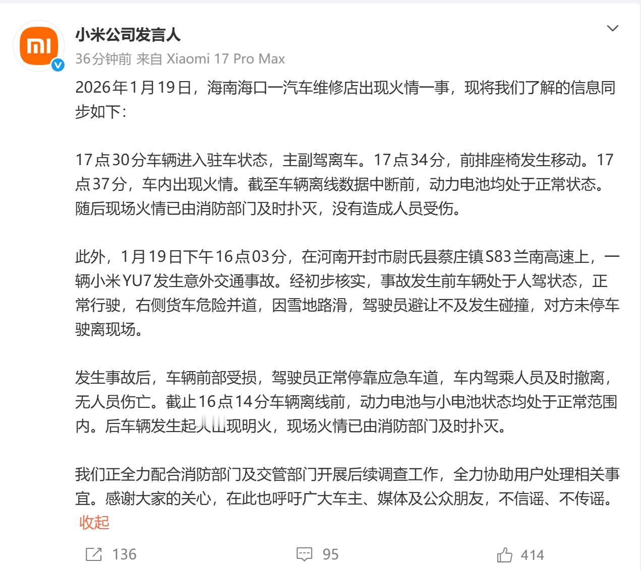 小米这次的公关回复给满分,看来新的公关负责人还是比较有节制的,公关最重要的,不是先去撇清关系,而是先把事实说清楚,以免引发社会恐慌小米公司发言人:2026年1月19日,海南海口一汽车维修店出现火情一事,现将我们了解的信息同步如下:17点30分车辆进入驻车状态,主副驾离车。17点34分,前排座椅发生移动。17点37分,车内出现火情。截至车辆离线数据中断前,动力电池均处于正常状态。随后现场火情已由消防部门及时扑灭,没有造成人员受伤。