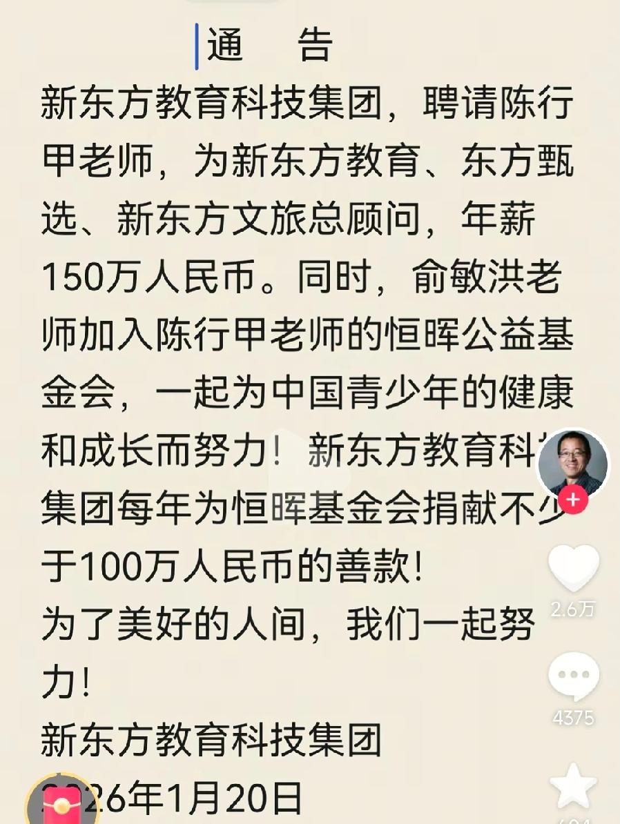 陈行甲刚辞70万,俞敏洪150万年薪来了!而且每年为恒晖基金捐100万!陈行甲真是“因祸得福”,失之东隅收之桑榆!事实证明,有资源、有能力、有价值,是金子总会发光的,到哪里都会发光的,何况陈行甲这样的社会受众支持人群的大名人,与俞敏洪又是好朋友,二人多次出游、参与活动,志趣相投的知己!恭喜祝福陈行甲!