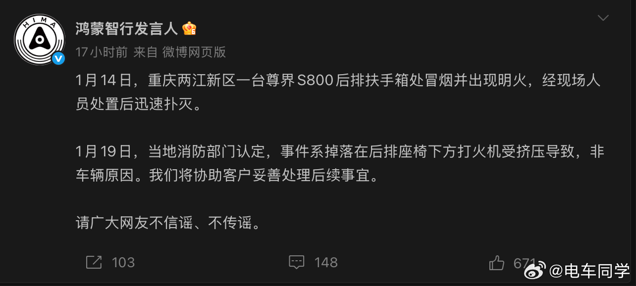 尊界就起火事件也做了回应...但打火机这玩应儿真的不能放车里,好多人随手就往门板箱、或者中控台一扔,尤其夏天太阳直射、或者温度过高会爆,很危险。尊界s800大v聊车