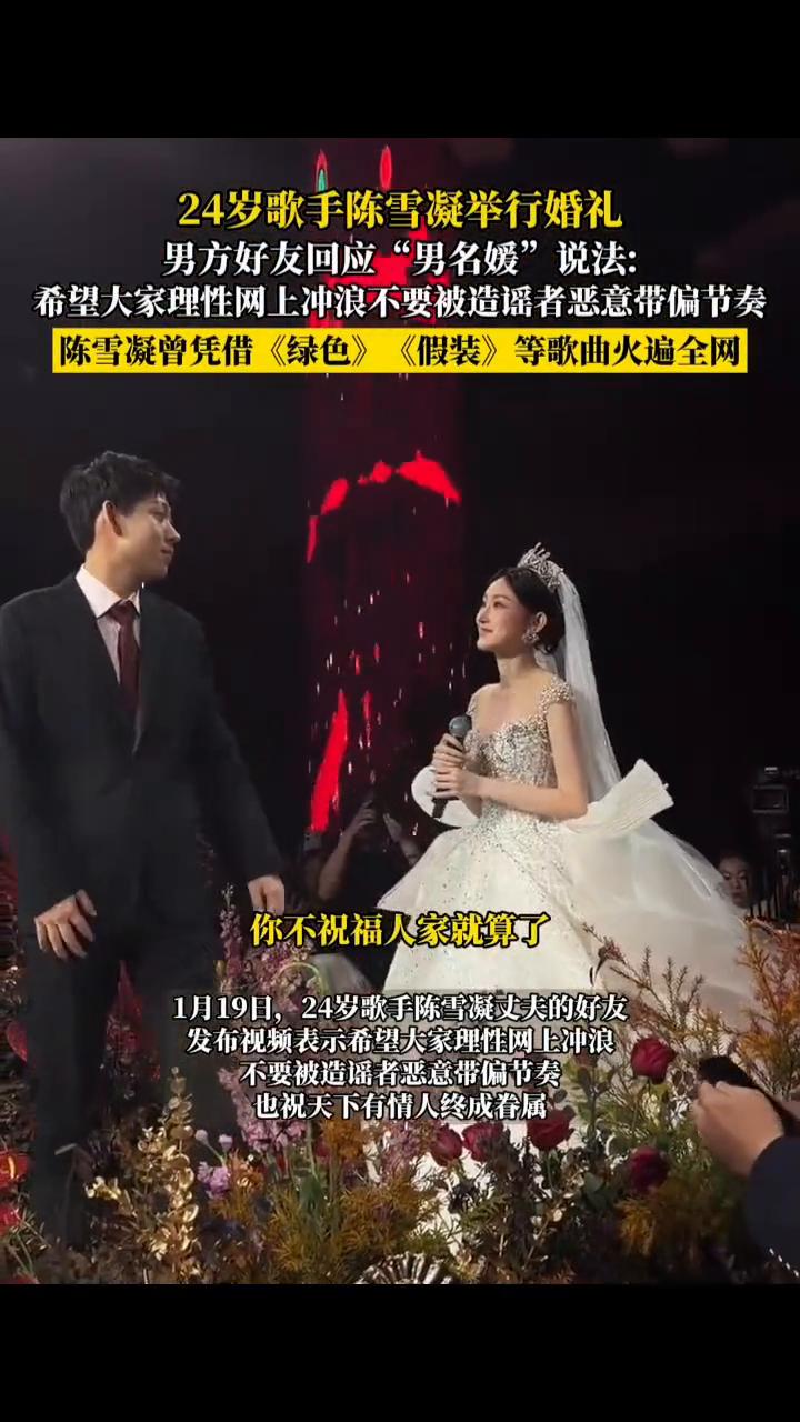 24岁歌手陈雪凝举行婚礼,男方好友回应"男名媛"说法:希望大家理性网上冲浪,不要被造谣者恶意带偏节奏。 1月19日,24岁歌手陈雪凝丈夫的好友发布视频表示希望大家理性网上冲浪,不要被造谣者恶意带偏节奏,也祝天下有情人终成眷属。 某位博主的行为我真的是无法理解,你不祝福人家就算了,你还发布一些不正当言论以及不实的信息。只要是又多金又帅的,你就给他标一个男名媛的标签,并且他还用自认为合理的理由告诉大家这个人有问题。