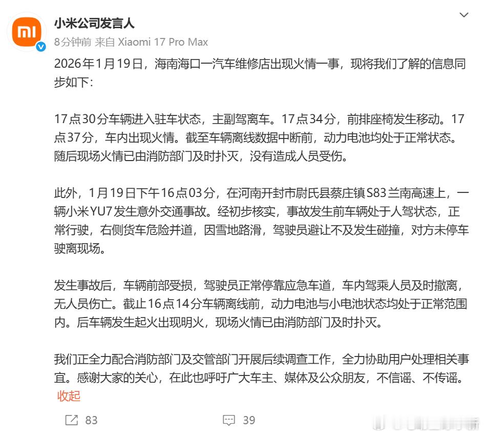 昨天的事,上午刚在群里刷到相关视频,然后就看到小米的回应,速度挺快的小米通报海南一汽车维修店火情 小米汽车通报两起事故细节