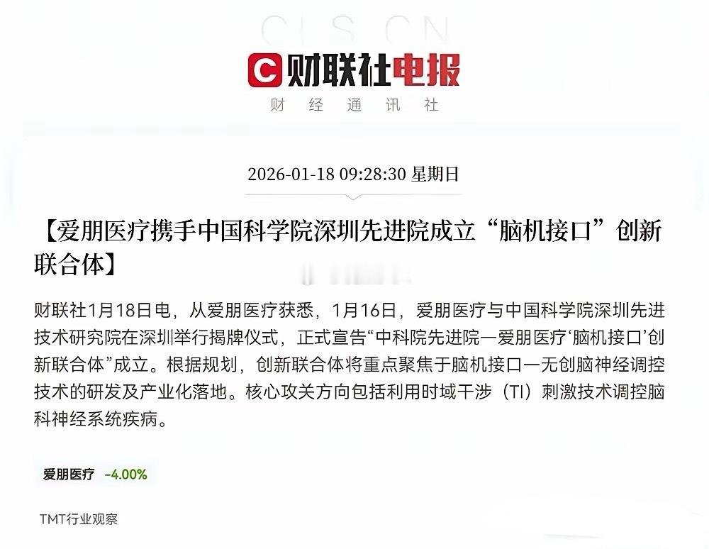 大利好!重大利好!脑机接口又迎来超级利好了,预计明日脑机接口概念要大爆发,满仓脑机接口的股民们有福了,要吃大肉了…刚看到下午的消息,爱朋医疗和中科院深圳先进院在深圳搞了个大动作,正式给两家联手的“脑机接口创新联合体”揭牌了。这种顶级科研机构加上上市公司的组合,确实让不少人瞬间坐不住了。我更在意的是,这次他们明确把目标锁定了“无创技术”。比起那些要在脑袋上动手术的方案,这种不用开颅的技术路线明显更接地气,感觉离普通人的距离一下拉近了不少。说个细节,这次合作不仅是为了搞科研,最核心的是明确了产业化路径。说白了,就是要把实验室里的高科技,变成咱们以后能买得到、用得起的成熟产品。现在的逻辑很清晰,就是想通过“医疗+消费”两条腿走路。以前大家都觉得这玩意儿只能在医院救命用,但如果真能像手机、耳机一样普及到消费电子领域,那想象空间就完全不一样了。我觉得最戳中市场痛点的,还是这种强强联手对成本的控制预期。一旦技术规模化落地,脑机接口设备就不再是天价,这才是产业爆发真正的催化剂。当然了,现在这种利好更像是一次精准的“点火”,毕竟有国家政策的积极响应在前面铺路,方向选对了,剩下的就是看后续落地的速度。哪怕是还没入场的,大概也能感受到这股热度。毕竟这种把医疗和智能交互结合起来的创新范本确实不多见,明天的盘面估计会非常有看头。