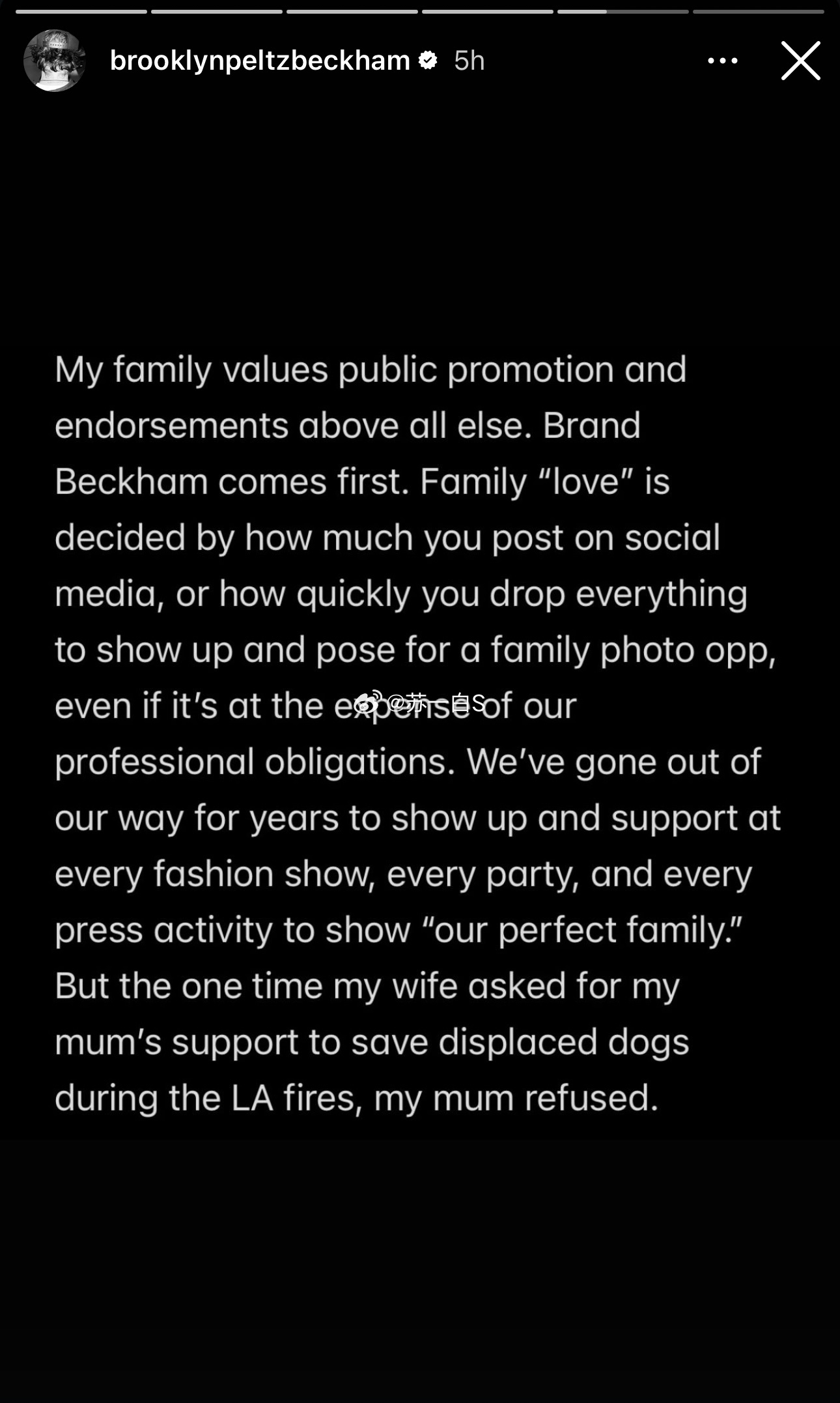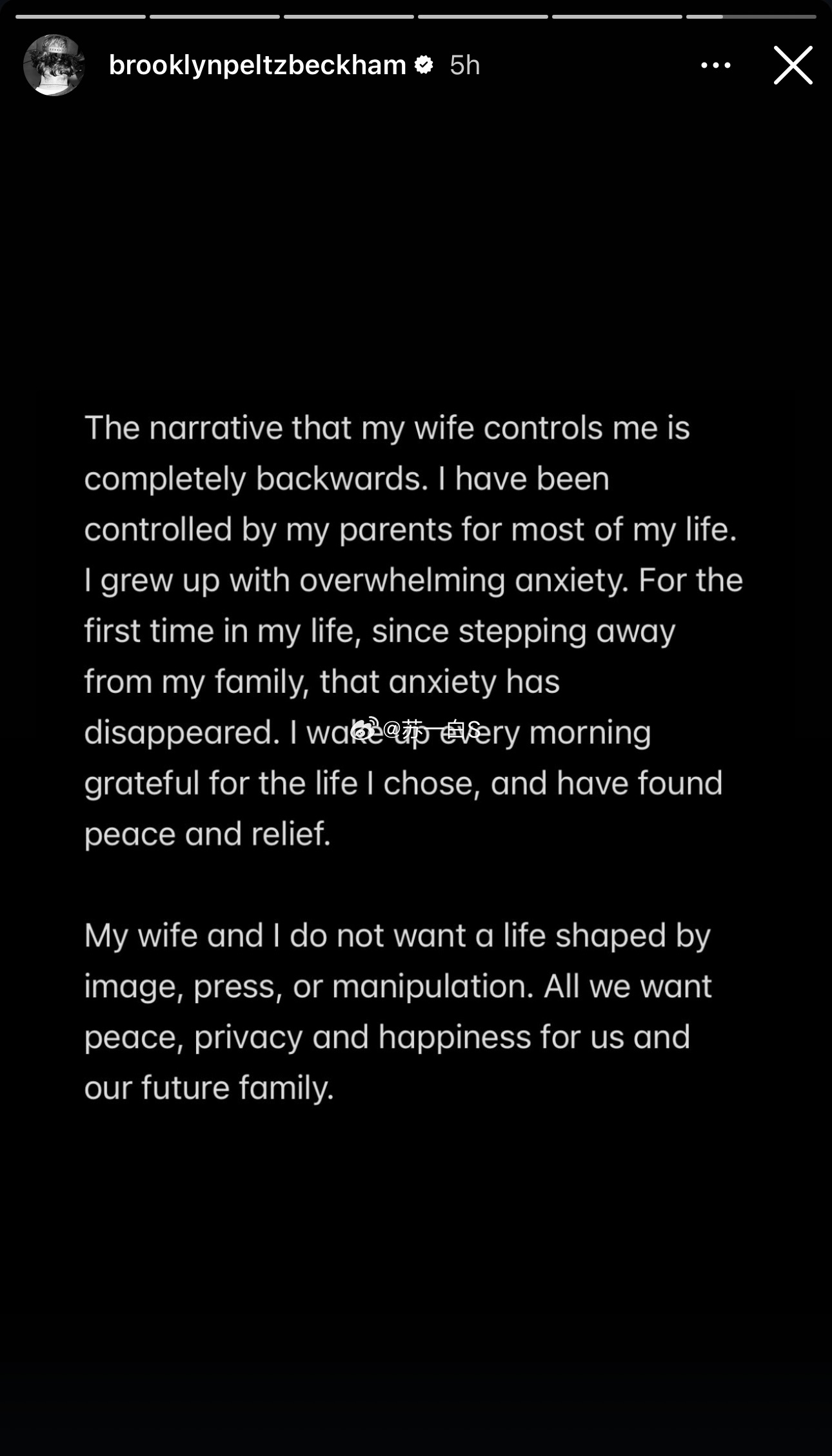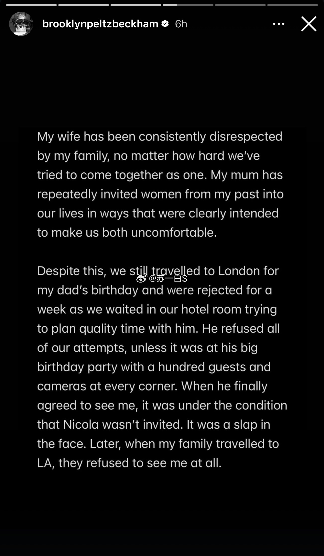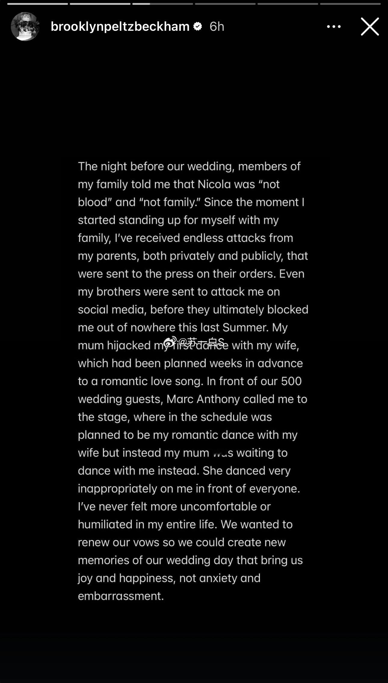 ‼️“大布”布鲁克林终于发声发长文抨击父母👇详细叙述从婚礼前到彻底决裂发生的种种事情‼️贝克汉姆遭大儿子控诉多年来,我一直保持沉默,竭尽全力将这些事情留在私下处理。不幸的是,我的父母以及他们的团队持续不断地向媒体放话,这让我别无选择,只能为自己发声,揭露那些已经被刊登出来的谎言中的一部分真相。我并不想与我的家庭和解。我没有被任何人操控,这是我人生中第一次真正站出来为自己说话。在我整个成长过程中,我的父母一直掌控着媒体中关于我们家庭的叙事。那些表演式的社交媒体发文、家庭活动以及并不真实的关系,一直是我出生后所被迫置身其中的生活常态。最近,我亲眼看到他们为了维持自身的表象,不惜在媒体上制造和散布无数谎言,往往是以无辜之人为代价。但我始终相信,真相终究会浮出水面。在我结婚之前,我的父母就已经开始不断试图破坏我的感情关系,而且这种行为从未停止。婚礼前的最后关头,我的母亲突然取消为Nicola制作婚纱——尽管 Nicola曾非常期待穿上她设计的礼服——迫使她不得不紧急另寻婚纱。在婚礼前几周,我的父母多次向我施压,甚至试图用金钱收买我,让我签署放弃自己姓名使用权的文件。这份协议将直接影响到我、我的妻子以及我们未来的孩子。他们坚持要我在婚礼前签字,因为那样协议条款才能正式生效。我拒绝妥协,影响了他们的“收益”,从那以后,他们对我的态度就再也没有一样过。在婚礼筹备期间,仅仅因为Nicola和我决定让我的奶奶Sandra以及Nicola的外婆Naunni与我们同桌——因为她们都已经失去了丈夫——我的母亲竟因此称我“邪恶”。双方父母各自都有与我们同样距离、同样规格的座位安排。婚礼前一晚,我的家人对我说,Nicola“不是血亲”、“不算家人”。自从我开始在家庭中为自己发声后,我就不断遭到父母私下和公开的攻击,而这些内容都是在他们授意下被送往媒体的。甚至连我的兄弟们也被派出来在社交媒体上攻击我,最终在去年夏天毫无预警地将我拉黑。我的母亲还破坏了我和妻子精心筹备数周的第一支婚礼舞曲。那本应是一支浪漫的情侣之舞。在500位宾客面前,Marc Anthony把我叫上舞台——按照流程,这一刻本应是我与妻子共舞——但等在那里的却是我的母亲。她在众目睽睽之下,以极不恰当的方式与我共舞。那是我人生中最感到不适和被羞辱的一刻。我们之所以想要重新宣誓誓言,是希望为婚礼创造新的回忆——这些回忆应当带来快乐与幸福,而不是焦虑与尴尬。无论我们多么努力想要真正成为一个整体,我的妻子始终持续遭到我家人的不尊重。我的母亲曾多次把我过去交往过(有过交集)的女性刻意带进我们的生活中,而且方式非常明显,就是有意让我们两个人都感到不舒服。尽管如此,我们仍然前往伦敦为我父亲庆生,却在酒店里被冷落了一整周,期间不断尝试安排与他的相处时间,却全部遭到拒绝,除非是在有上百名宾客、四处布满镜头的大型生日派对上。后来他终于同意见我,却附加条件:Nicola不能出席。这对我来说是赤裸裸的羞辱。随后,当我的家人来到洛杉矶时,他们彻底拒绝与我见面。在我的家庭里,公众曝光、商业推广和品牌形象高于一切。“贝克汉姆品牌”永远排在第一位。所谓的“家庭之爱”,取决于你在社交媒体上发了多少内容,或者你是否能立刻放下一切,赶去配合一次家庭公开合影,哪怕这会牺牲我们的职业责任。多年来,我们竭尽所能出席每一场时装秀、每一次派对、每一次媒体活动,只为维持“完美家庭”的形象。但当我的妻子唯一一次请求我母亲的支持,希望她帮助在洛杉矶山火中流离失所的狗时,我的母亲却拒绝了。“我的妻子控制我”的说法完全颠倒黑白。事实上,我人生中的大部分时间,一直是被我的父母所控制。我在极度焦虑中长大。而自从我选择远离家庭,这是我人生中第一次感到焦虑彻底消失。我每天醒来,都为自己选择的生活心怀感激,并终于找到了平静与解脱。我和我的妻子不想要一个被形象、媒体或操控所塑造的人生。我们只想要属于我们自己,以及未来家庭的平静、隐私与幸福。(他叙述的版本,从婚纱到婚礼上的第一支舞再到Nicola求维多利亚转发帮助狗狗遭拒,跟之前整理的媒体报道的细节贴合👉网页链接)