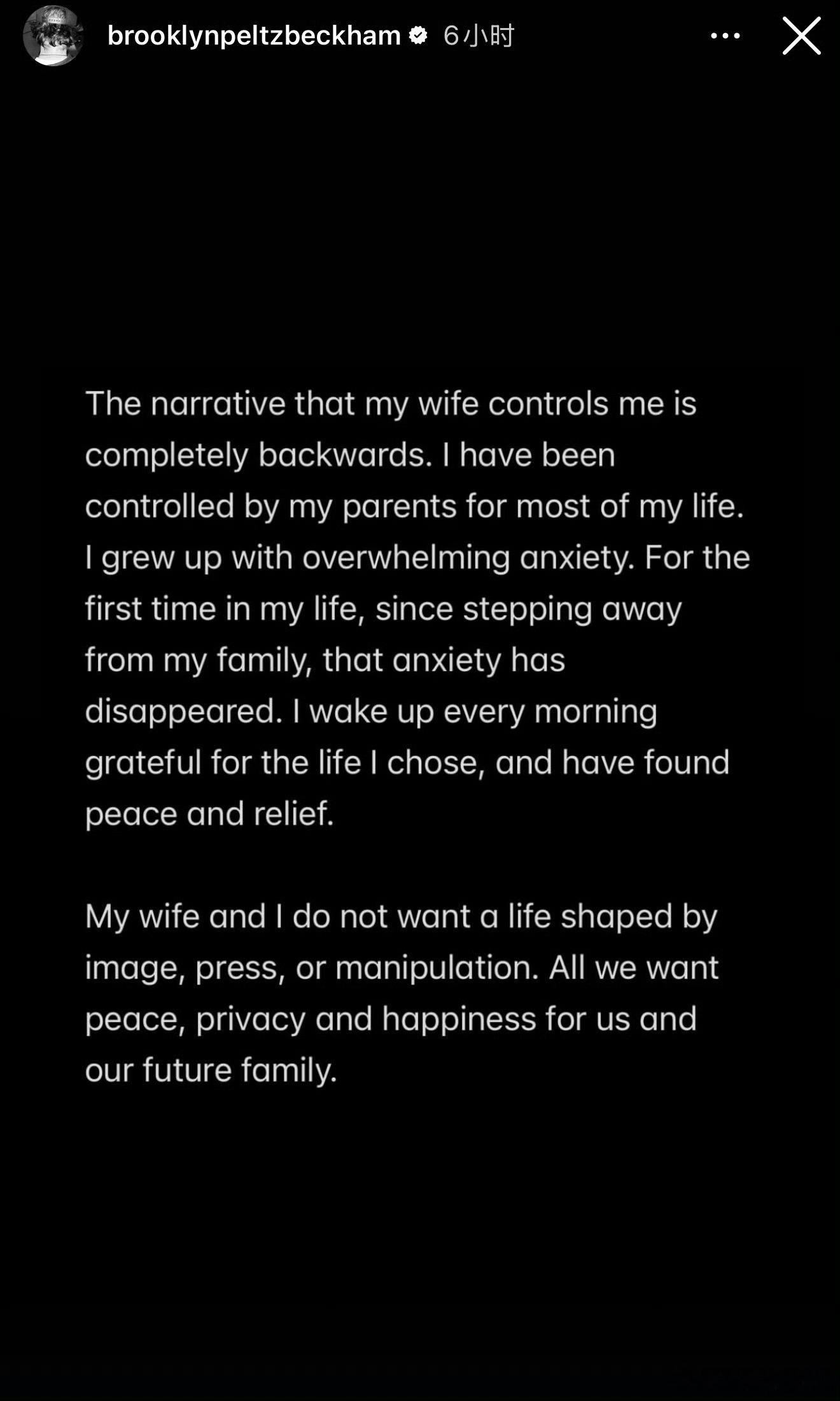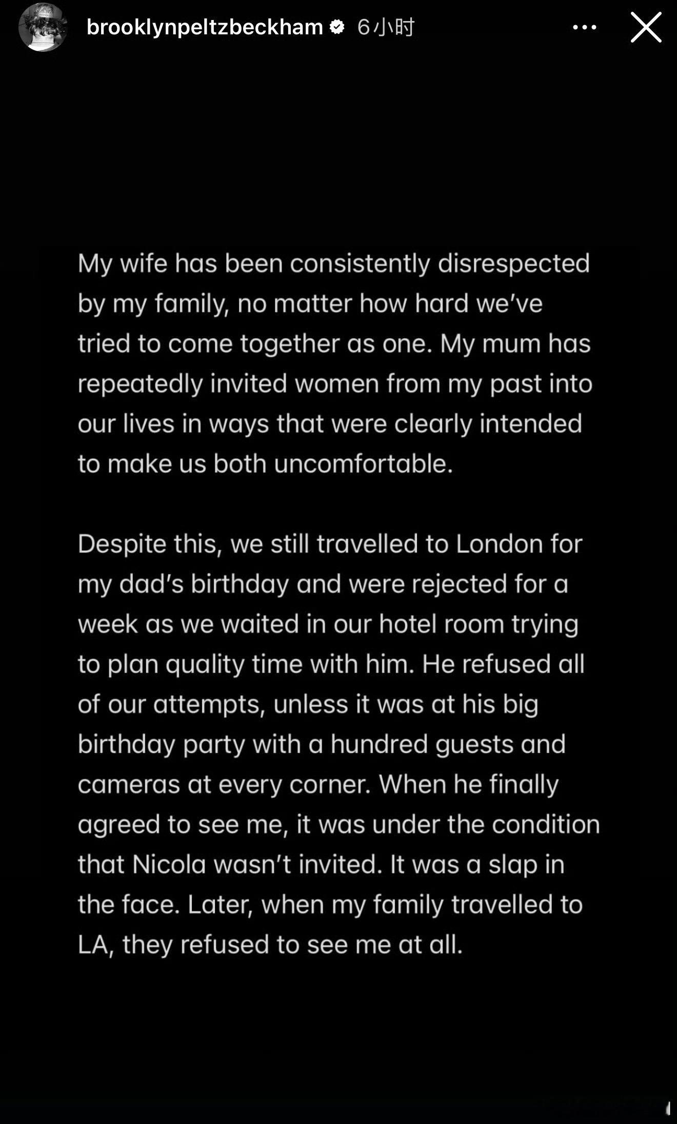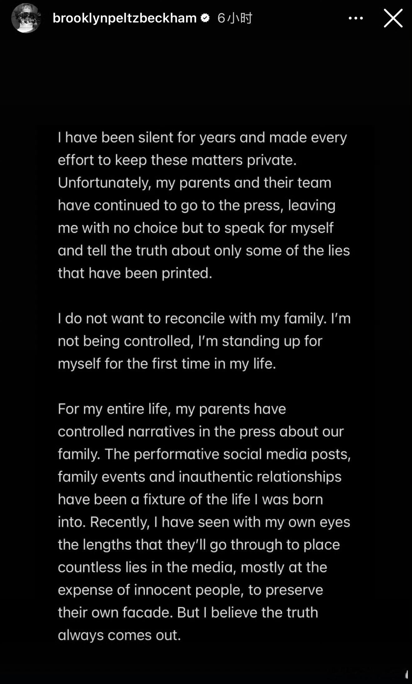 贝克汉姆遭大儿子控诉 这个热搜话题不准确 全文看下来 大布对老妈意见更大!“我多年来一直保持沉默,并尽一切努力让这些事情保密。不幸的是,我的父母和他们的团队持续向媒体发声,这让我别无选择,只能为自己发声,揭露那些被报道的部分谎言背后的真相。我不想和家人和解。我没有被控制,这是我人生中第一次为自己挺身而出。我的父母一辈子都在操控媒体上关于我们家庭的叙事。表演式的社交媒体帖子、家庭活动和虚伪的关系,是我生来就面对的生活常态。最近,我亲眼看到他们为了在媒体上散布无数谎言——大多是以牺牲无辜者为代价——来维持自己的体面形象,会做出怎样的事。但我相信真相总会水落石出。我的父母早在我婚礼前就一直想方设法破坏我的感情,而且至今没有停止。我母亲在最后一刻取消了为Nicola制作婚纱的计划,尽管她当初对能穿上母亲设计的裙子充满期待,这迫使她不得不紧急寻找新的婚纱。在我们大喜的日子到来前几周,我的父母不断施压,甚至试图贿赂我,让我签署协议放弃自己姓氏的相关使用权利——这会影响到我、我的妻子,以及我们未来的孩子。他们坚持要我在婚礼日期前签字,因为这样协议条款就会生效。我拒绝签字影响了他们的“收益”,从那以后他们对我的态度就彻底变了。在筹备婚礼期间,就因为Nicola和我选择把我的保姆Sandra奶奶,还有Nicola的外婆安排在我们的主桌和我们坐在一起,因为她们的丈夫都已经不在了,我母亲甚至骂我“邪恶”。而我们双方的父母都有各自的桌子,并且位置都和我们的主桌相邻。婚礼前一晚,我的家人告诉我,妮可拉“不是血亲”、“不算家人”。自从我开始在家人面前为自己争取权益,我就不断遭到父母的攻击,这些攻击既有私下的,也有公开的,而且都是他们授意媒体发布的。就连我的兄弟们也被指使在社交媒体上攻击我,直到去年夏天他们突然毫无征兆地把我拉黑。我妈妈强行打断了我和妻子的第一支舞——这支舞我们提前几周就计划好了,要用一首浪漫的情歌。在我们500位婚礼宾客面前,马克·安东尼把我叫到台上,原本的安排是我和妻子跳这支浪漫的舞,可等着我的却是我妈妈。她在所有人面前和我跳得非常不合时宜,我这辈子从未感到如此不适和羞辱。我们想重新举办婚礼宣誓仪式,这样就能为我们的婚礼日创造新的、充满喜悦和幸福的回忆,而不是焦虑和尴尬。无论我们多么努力想一家人和睦相处,我的妻子一直都在被我的家人轻视。我妈妈还屡次邀请我过去交往过的女性进入我们的生活,显然是想让我们俩都感到不舒服。尽管如此,我们还是特意飞去伦敦参加我爸爸的生日,却在酒店房间里等了整整一周都被拒之门外,我们想和他好好相处一下,他却拒绝了我们所有的尝试,除非是在他那有上百位宾客、每个角落都有摄像机的大型生日派对上。当他最终同意见我时,条件却是不允许妮可拉到场。这简直是一记耳光。后来,当我的家人来到洛杉矶时,他们干脆完全拒绝见我。我的家人把公开宣传和品牌代言看得高于一切。“贝克汉姆品牌”才是第一位的。家庭的“爱”取决于你在社交媒体上发了多少内容,或者你能不能立刻放下一切去配合拍家庭合影——哪怕这会影响我们的工作安排。多年来,我们特意出席了每一场时装秀、每一场派对和每一次媒体活动,只为塑造“我们是完美家庭”的形象。但有一次,我妻子请求我妈妈在洛杉矶野火期间帮忙救助流离失所的狗狗时,我妈妈却拒绝了。那种“我被妻子控制”的说法完全是颠倒黑白。我人生的大部分时间都被父母控制着。我在极度的焦虑中长大。而在我远离家人之后,人生中第一次,这种焦虑消失了。我每天早上醒来都心怀感激,感谢自己选择的生活,我找到了内心的平静和释然。我和我的妻子不想要被形象、媒体或操控左右的生活。我们只想要平静、隐私和幸福,为我们自己,也为我们未来的家庭。”