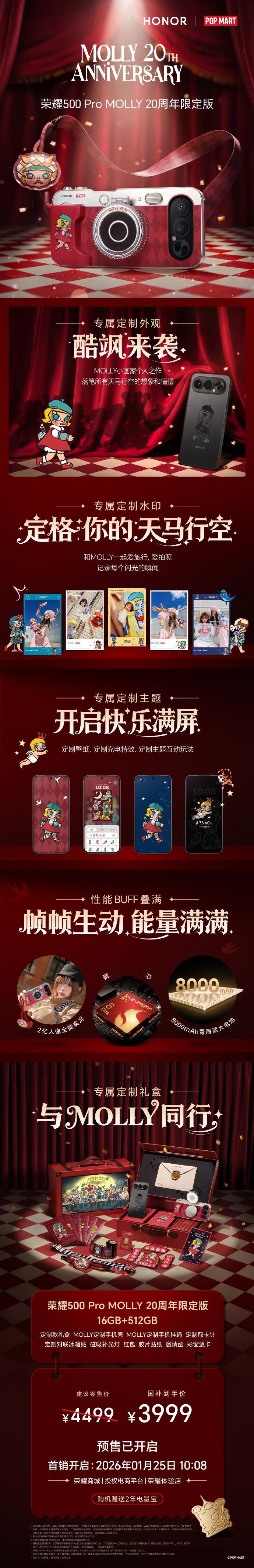 荣耀500 Pro MOLLY 20周年限定版礼盒专属外观、专属配件、专属定制水印、专属定制主题,初代IP的含金量还是很高的,应该很多人会入手吧