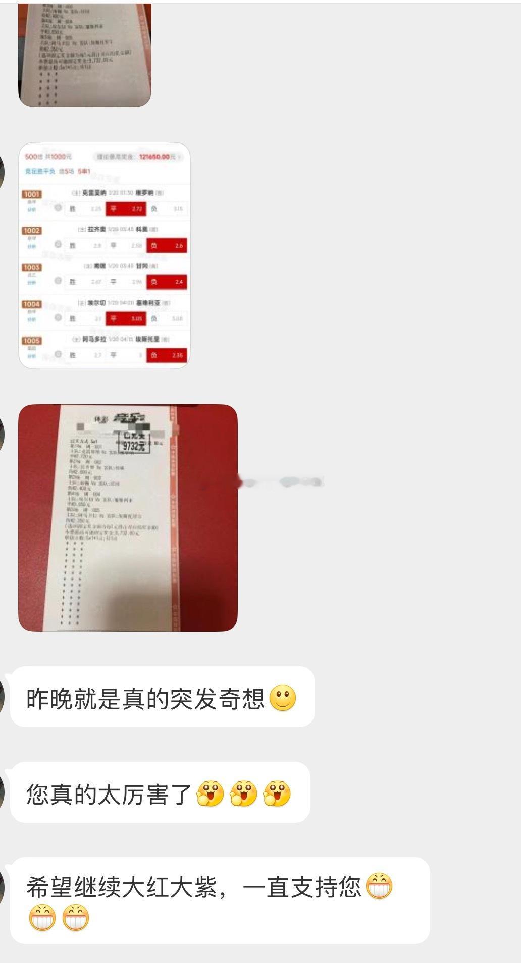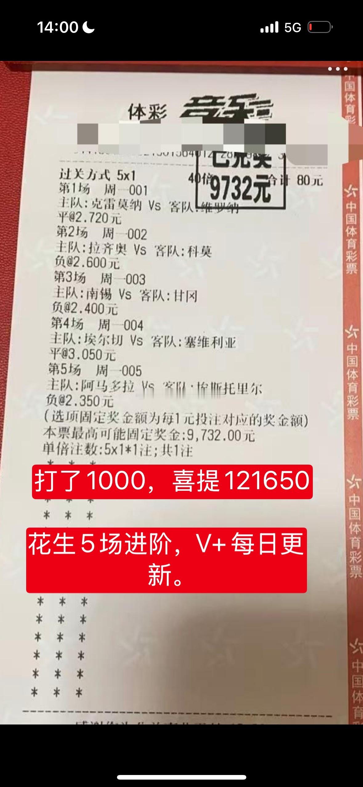 有粉丝跟花生昨天的进阶5串1跟了1000,喜提121650!!其实店里还有很多进阶2串进阶3串的,还有单选比分,加起来所有中奖票都快突破40个了,真的是大红大紫的一天!!而且单选比分这个拉齐奥0-3,24倍是真的舒服,上一次也是买的0-3拉齐奥,也是20多倍,单选比分够意思,收的就舒服,其实距离百万大奖也不远了,我们加油。欢迎大家加入V+,现在有优惠,只要188,别再错过了,欢迎大家,入口: 网页链接