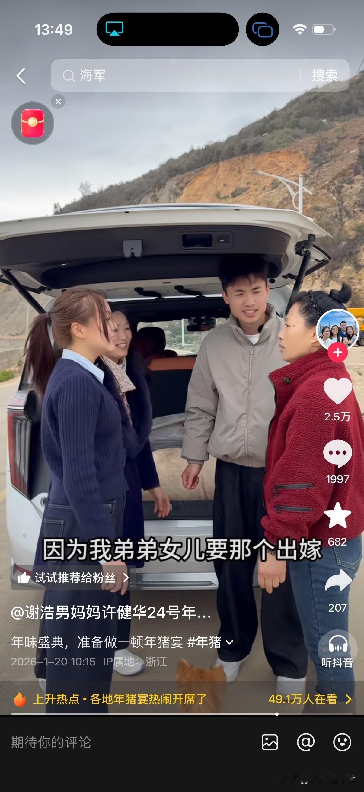 今天上午,谢浩男妈妈许健华更新了一条视频。视频里,谢浩男妈妈许健华、大妹和海军一起去海军家“偷年猪”。不得不说,海军妈妈真的很厉害,一个女子抓猪的动作极为娴熟,由此能看出她平日里没少干男人的活,是个实打实的女强人!