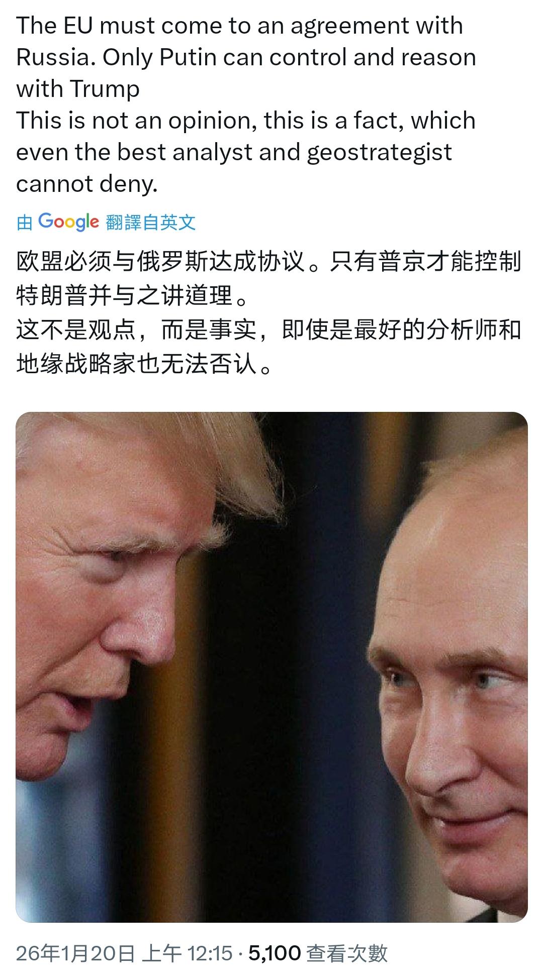 这是一个100%正确的观察。 特朗普变乱行为的“刹车皮”有两块,一是国内,一是普京。 欧盟的确可以从这两块刹车块作文章,问题是哪块成本更低效率更高,更有利于欧盟的整体利益。毫无疑问,普京遥遥领先。 跟俄罗斯和解,对于欧洲是双赢;讨好民主党,那成本高可不及,效率可低多了。 Source: X