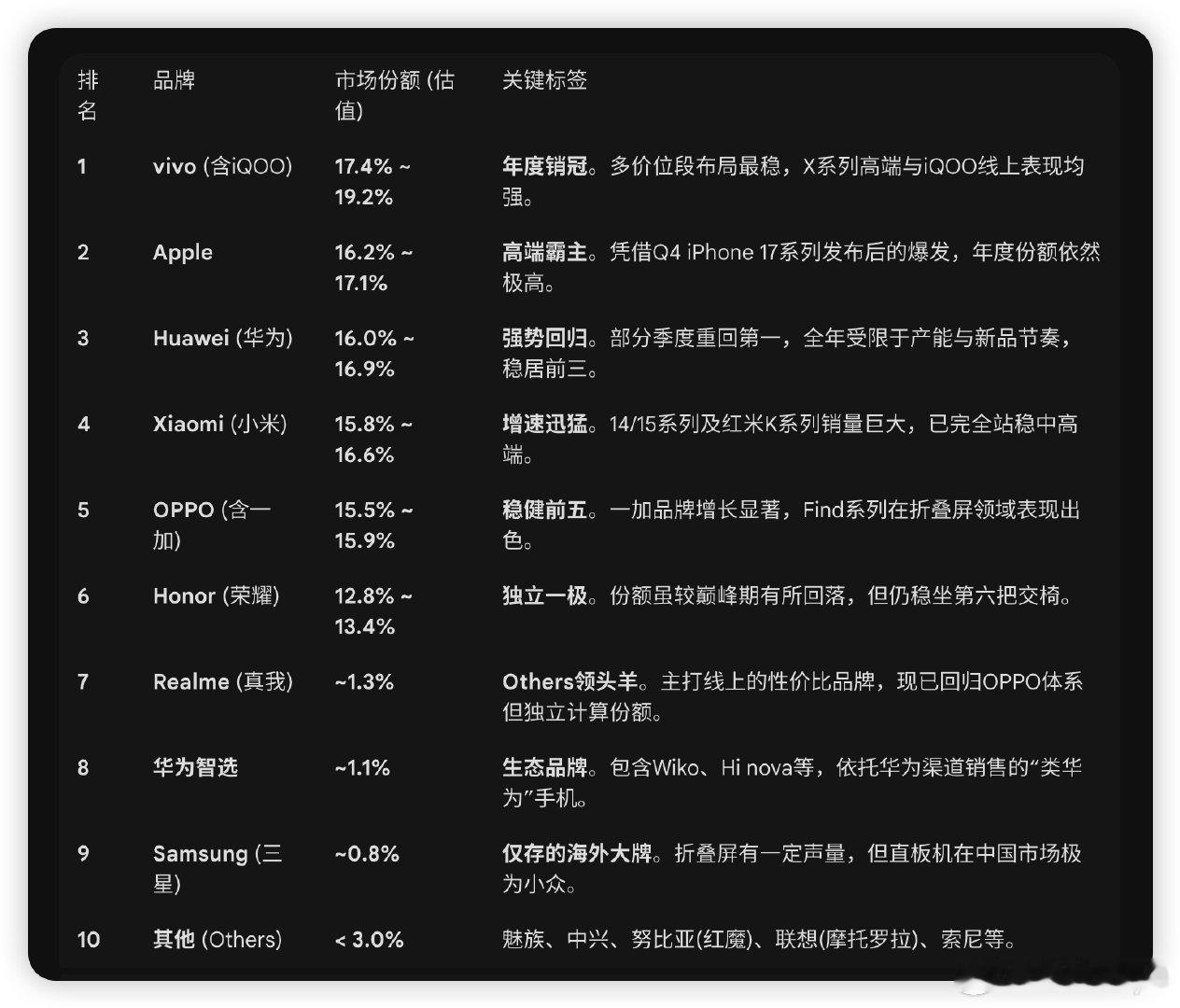 哪家厂商接近机圈斩杀线机圈现在的“斩杀线”,早不是倒闭而是没资格上桌~ 华米OV果耀分走95%份额,Others们只能夹缝求生。AI跟不上、拿货没话语权、缺生态护城河,这三座大山压得小厂喘不过气。光堆料没用,没车企撑腰、搞不定大模型,终究只能慢慢淡出视野呀~智能手机手机测评 斩杀线护城河华为小米ApplevivoiPhone