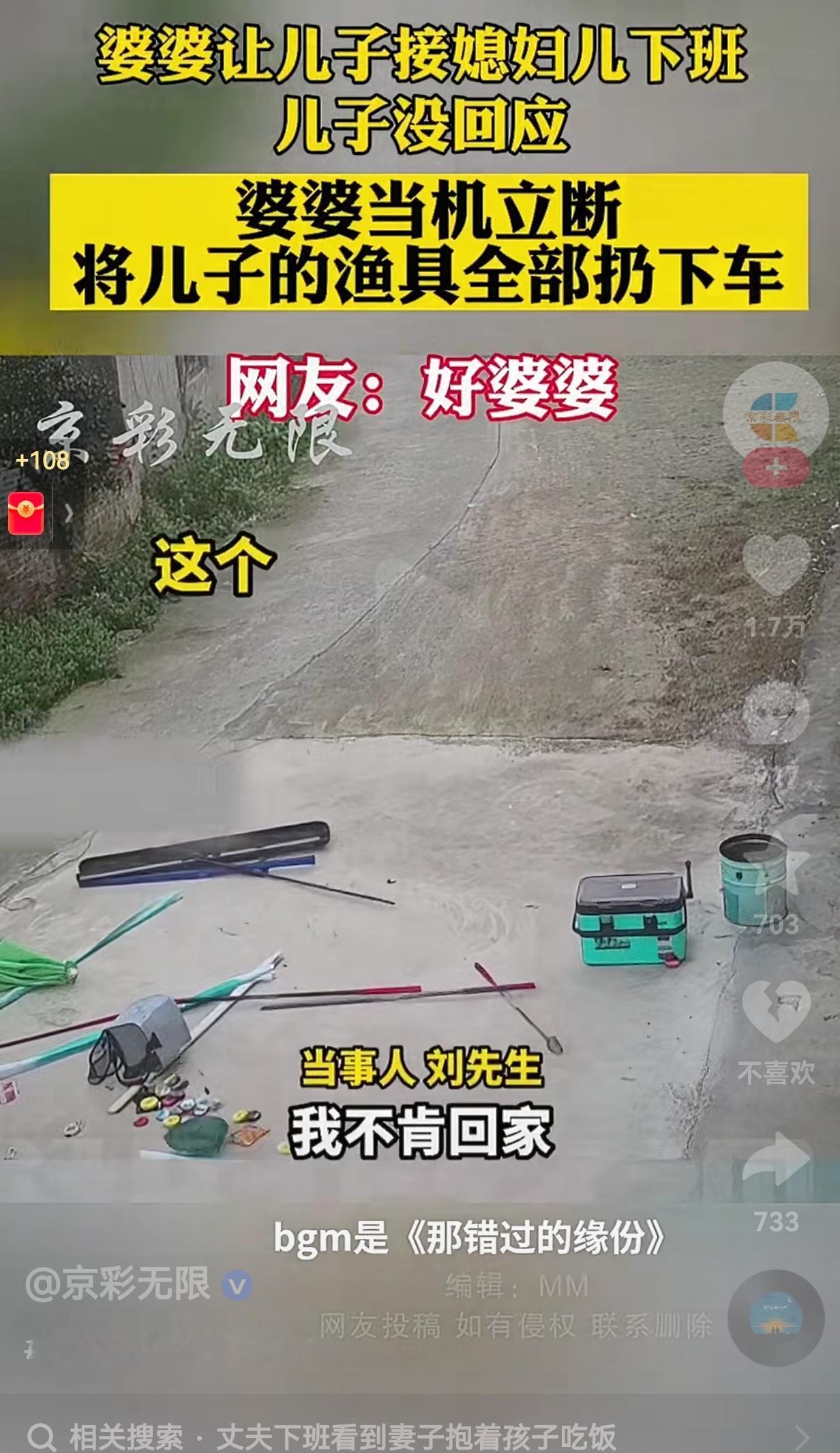 这婆婆太通情达理了!湖北黄冈的刘先生这天正好休息,闲来无事,就跟老表在外面钓鱼,这一段时间鱼口正好,钓鱼钓的正开心的时候。 突然,老妈给自己打电话了,儿子一想就不是什么好事,因此他一直装作没有听到,就这样,老妈给他打了十几个电话,他愣是没有接听。 老妈知道儿子是什么德行,一气之下竟然直接把儿子的渔具全扔下车,鱼竿、鱼桶、鱼护散落一地,逼他去接人。 妹妹看到后,给哥哥发了消息,妹妹跟哥哥说:“咱妈打电话让你去接嫂子下班,你没有接电话,老妈把你的渔具全都扔了。” 刘先生看到消息后,这才匆忙回家,回来看到这一幕,他是又气又笑,只能乖乖去接媳妇。 网友们纷纷评论:“这才是真正的好婆婆!” 还有的网友说:“妈妈的做法看似不近人情,对儿子太过于严苛了,其实,这也是为了儿子好,毕竟,儿媳妇好,儿子才会好,他们的小家才会和睦。”  其实,这位婆婆拎得清:她知道儿媳是要跟儿子过一辈子的人,心疼儿媳就是心疼儿子的小家。 她用扔渔具的方式,不仅让儿子去接了儿媳,更教会他一个道理:家庭比爱好更重要,老婆比钓鱼重要。 这位婆婆的做法,给所有的婆婆做了一个好的榜样:真正为儿子好,就是帮他经营好婚姻,让他懂得疼老婆。 话说,如果你是这位婆婆,会用这种方式逼儿子去接儿媳吗?